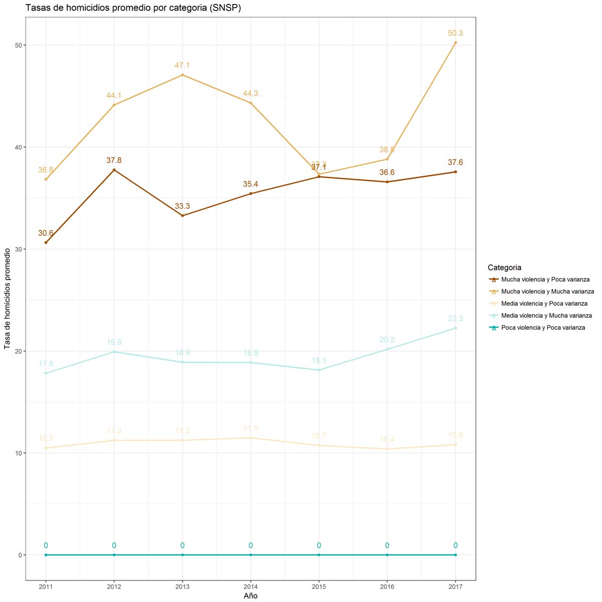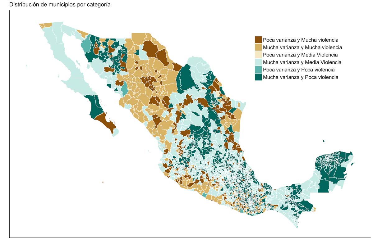 Por su parte, de los 15 municipios que siempre han sido violentos – según nuestra clasificación – siete se encuentran en Oaxaca: Miahuatlán De Porfirio Díaz, Huautla De Jiménez, San Pedro Pochutla, Heroica Ciudad De Ejutla De Crespo, Oaxaca De Juárez, Villa De Tututepec De Melchor Ocampo, Ocotlán De Morelos. Al haber sido siempre violentos (por la poca varianza que tienen) estos municipios no nos explicarían una variación en la tasa de homicidios nacional. Tampoco los municipios que tengan poca o media violencia explicarían el aumento reciente de violencia; en su mayoría, los municipios con poca violencia no registraron ningún homicidio durante este periodo.