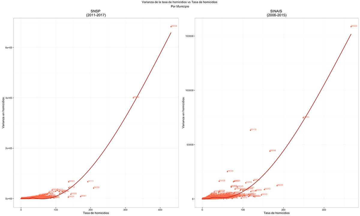 Creo que sería interesante hacerlo también por zonas o grupos de municipios, si en dos municipios colindantes hay un año 20 muertes en A y 2 en B y al siguiente 3 en A y 18 en B, podemos meter a los municipios en el saco de los que tienen mucha varianza pero la zona tendría poca varianza. Lo de compararnos con Honduras y el tono que se usa al respecto no me parece adecuado, estamos más cerca de sus niveles que de los de Europa.