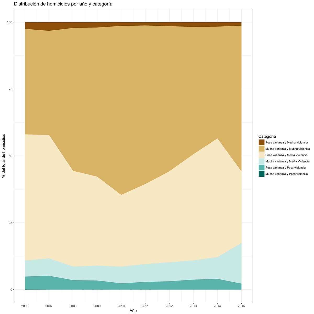 Lo que vemos entonces es que, bajo nuestra clasificación, 1,260 municipios tienen tasas de violencia consideradas bajas, por debajo de cuatro. El grueso de la población nacional se encuentra en municipios de violencia media y con poca varianza, con una tasa promedio en todo el periodo de 12 homicidios por cada 100 mil habitantes, aún por encima de los 10 establecidos por la Organización Mundial de la Salud para considerarse una epidemia. Notoriamente, hay 15 municipios en el país con un nivel permanentemente alto de violencia durante toda la década, alrededor de 40 homicidios por cada 100 mil habitantes.