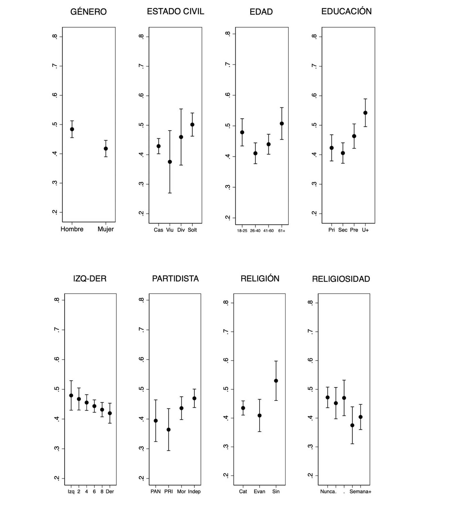 Para entender el perfil de los entrevistados que apoyan que las mujeres puedan abortar cuando así lo decidan, la Gráfica 2 reporta los resultados entre distintos grupos: según actitudes políticas, características sociodemográficas y religiosidad. En dicha gráfica, los resultados representados en el eje vertical de cada panel van de 0 a 1, donde 1 representa el máximo apoyo al aborto y 0 el máximo rechazo al aborto. Los “brazos” alrededor de cada punto corresponden a intervalos de confianza al 95%. Dichos resultados son producto de un modelo de regresión lineal.16