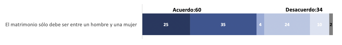 15 Es posible que en esta encuesta el apoyo al matrimonio igualitario esté subestimado ya que el fraseo indaga si los entrevistados están de acuerdo con el matrimonio tradicional (“el matrimonio debe ser entre un hombre y una mujer”); en otras palabras, la pregunta está fraseada en sentido negativo. Si la encuesta se basara en un fraseo alternativo en sentido positivo ("¿está usted de acuerdo o en desacuerdo con el derecho de las parejas homosexuales de casarse?”), es posible que el apoyo al matrimonio igualitario registrara un apoyo más alto.