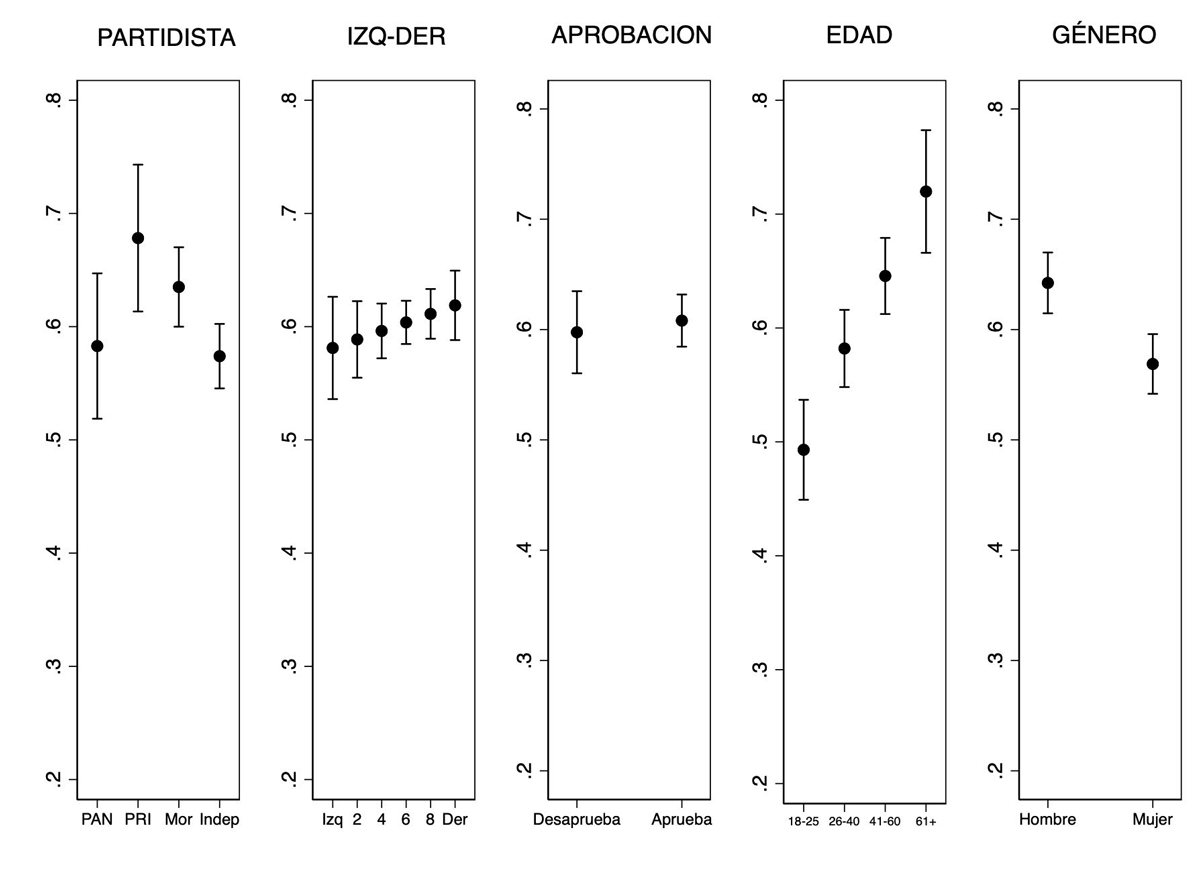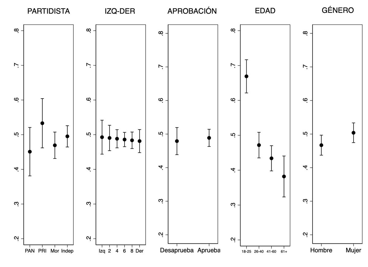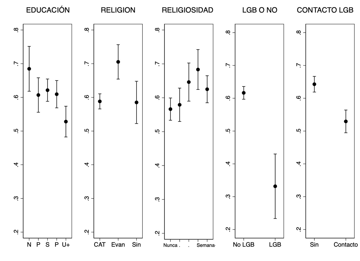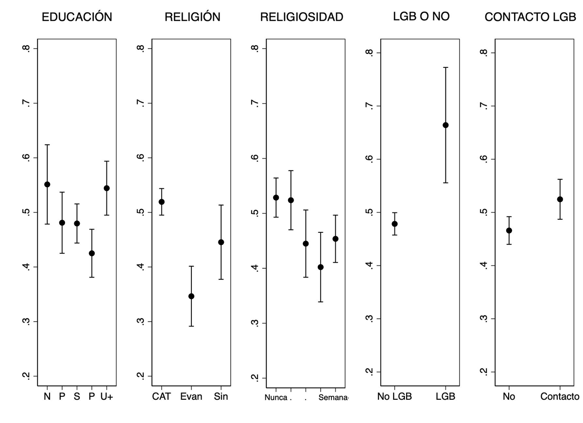 16 Las gráficas 2 y 4 son producto de un análisis de regresión lineal en el que se incluyeron las siguientes variables independientes: género, educación, edad, identidad partidista, aprobación presidencial, ideología izquierda-derecha, religión, asistencia a la iglesia (religiosidad), cercanía con la comunidad LGB y autoidentificarse como LGB. Para facilitar la interpretación, los resultados que se reportan en el texto son producto de una regresión OLS. Los resultados que se obtienen por medio de un modelo ordinal logístico son sustancialmente iguales.