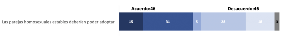 El Estudio Nacional Electoral de México 2021 también incluyó una segunda pregunta que indaga el acuerdo o desacuerdo con que “las parejas homosexuales estables deberían poder adoptar” (totalmente de acuerdo/acuerdo/ni acuerdo ni desacuerdo/desacuerdo/totalmente en desacuerdo). En esta pregunta se encuentra una opinión más polarizada: 46 % de los entrevistados expresó acuerdo, y otro 46 % desacuerdo (Gráfica 3). Tal como en el caso anterior, las actitudes políticas no están asociadas al apoyo a la adopción gay (Gráfica 4). En dicha gráfica, los resultados representados en el eje vertical van de 0 a 1, donde 1 representa el máximo apoyo a la adopción homoparental y 0 el máximo rechazo a la adopción homoparental. A diferencia de la pregunta sobre matrimonio, el género o los niveles de educación no están asociados al rechazo o apoyo al derecho a la adopción. En cambio, la edad, la orientación sexual y la hipótesis de contacto son los factores más importantes que explican el acuerdo con el derecho a adoptar de las parejas LGBT: los más jóvenes junto con las personas que se identifican como gays, lesbianas o bisexuales son quienes más están de acuerdo con la adopción LGBT. Igualmente, las personas que tienen amigos o familiares que forman parte de la comunidad LGBT expresan más acuerdo.