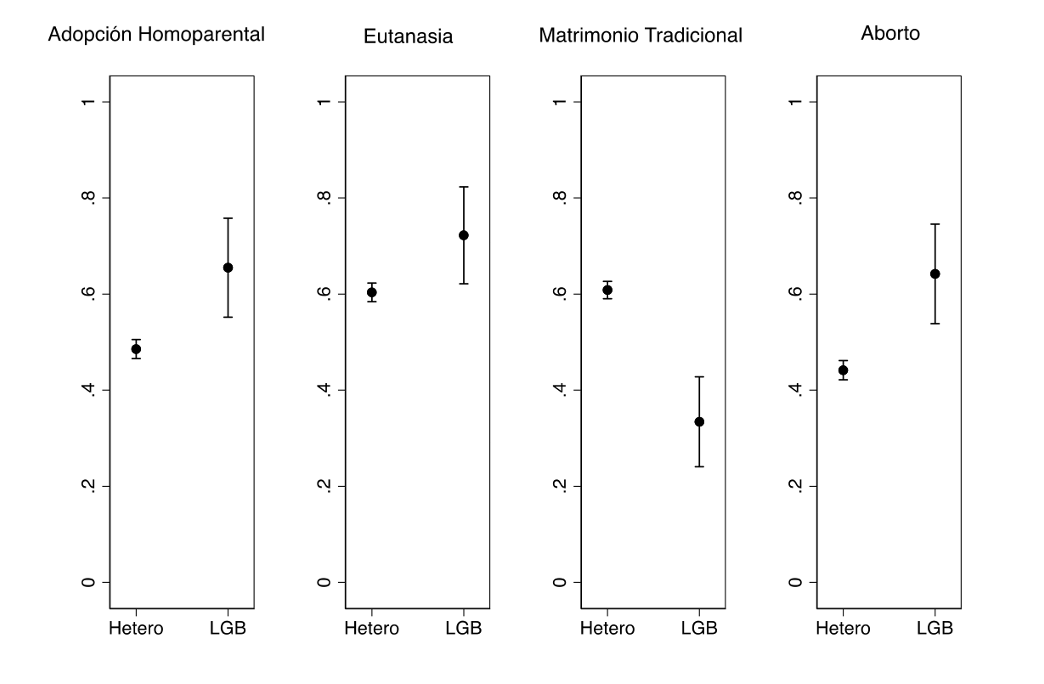 19 Las siguientes gráficas son producto de un análisis de regresión en el que se incluyeron las siguientes variables independientes: identificarse como LGB, género, educación, edad, identidad partidista, religión y asistencia a la iglesia (religiosidad). Para facilitar la interpretación, los resultados que se reportan en el texto son producto de una regresión lineal OLS. Los resultados que se obtienen por medio de un modelo ordinal logístico son sustancialmente iguales.