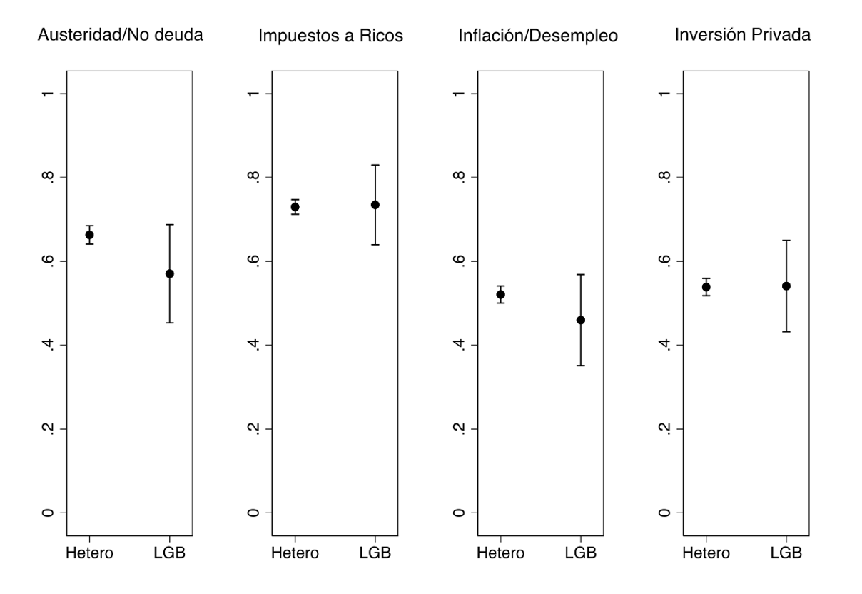 Ahora bien, a diferencia de las preguntas sobre temas morales, la orientación sexual no parece tener un efecto diferenciador en temas económicos, como es posible observar en la Gráfica 3. Estas preguntas indagan sobre el acuerdo o desacuerdo con la austeridad fiscal, el control de la inflación o el desempleo, el impuesto a los ricos y la participación del sector privado en la industria eléctrica. Esta diferencia se explica probablemente porque la orientación sexual no está explícitamente conectada con dichos temas económicos, como sí lo está con los temas morales/culturales, en tanto que los temas LGBT han sido tradicionalmente una parte importante de las guerras culturales en México y a nivel internacional, junto con temas como el aborto, eutanasia, etc. Además, como proponen diversos autores, el contexto de discriminación en el cual se desarrolla esta comunidad la hace más propensa que se inclinen por ideales asociados con la izquierda en temas culturales y sociales21, 22 pero no necesariamente se traducen en una agenda económica, sobre todo si las élites políticas no lo conectan explícitamente.