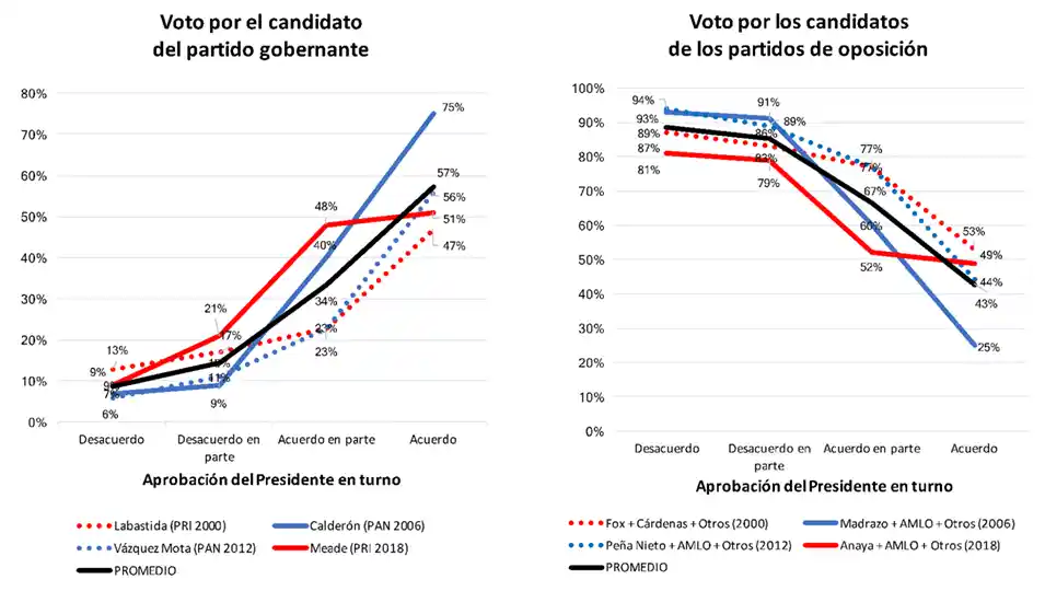 Estos datos en realidad no son del todo sorprendentes. Sólo el presidente que decididamente apoyó al candidato de su partido durante la campaña fue capaz de movilizar la aprobación a su gobierno a favor de candidato de su partido. Ese es el caso del expresidente Fox que no escatimó en su apoyo a Felipe Calderón durante la campaña presidencial de 2006, al borde de generar una crisis postelectoral por su intervención durante las campañas. En cambio, en 2012, Felipe Calderón —quien habría preferido ver a su secretario de Hacienda, Ernesto Cordero, como candidato de su partido—n o apoyó decididamente a Josefina Vázquez Mota, la candidata de su partido (e incluso, versiones periodísticas rumoran que su gobierno apoyó en realidad a uno de los candidatos de oposición). En el caso de los presidentes priistas, si bien Ernesto Zedillo tuvo un papel fundamental para designar a Francisco Labastida como el candidato de su partido, ya en la campaña, Zedillo optó por no entrometerse y garantizar una elección libre más allá de las presiones de su propio partido para influir en la elección. Enrique Peña Nieto tampoco tuvo un papel mediático relevante durante la campaña y su partido optó —seguramente por la muy baja aprobación presidencial de Peña Nieto, la más baja desde la transición a la democracia en México— por realzar la capacidad técnica e incluso la militancia independiente de su candidato, José Antonio Meade. Cuando el gobierno de Peña Nieto intervino en la campaña, más que para movilizar apoyo para su candidato, fue para iniciar una investigación sobre posibles actos de corrupción en contra de uno de los candidatos de la oposición, Ricardo Anaya.