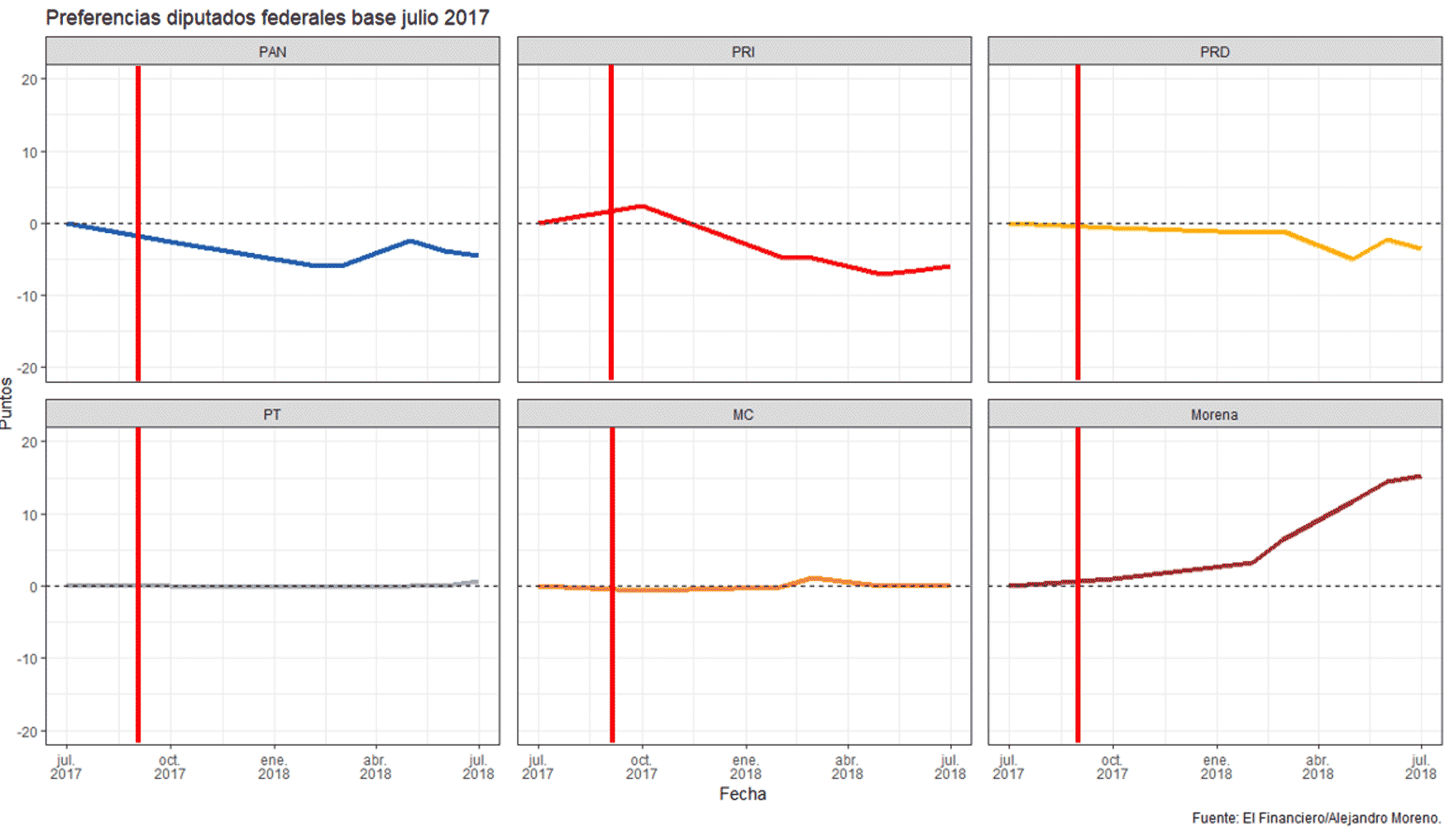 Así, a partir del anuncio en septiembre de 2017, es decir, comparando julio y octubre, los partidos coaligados aparentemente cayeron de manera unánime. El PAN se llevó la peor parte, con casi tres puntos porcentuales menos en tres meses. Le siguió el PRD, con un cambio de alrededor de un tercio del sufrido por el PAN, dentro del margen de error. Más aún, con algunas recuperaciones episódicas, las tendencias del PAN y el PRD fueron descendentes el resto del proceso electoral. MC tuvo un descenso apenas perceptible, y de hecho indistinguible de cero considerando el margen de error, pero que hace muy improbable que haya crecido y que se haya mantenido estable. Como se dijo antes, se trata de cambios que no se pueden dar por ciertos debido a que son menores al margen de error de las encuestas —alrededor de 3 %—.