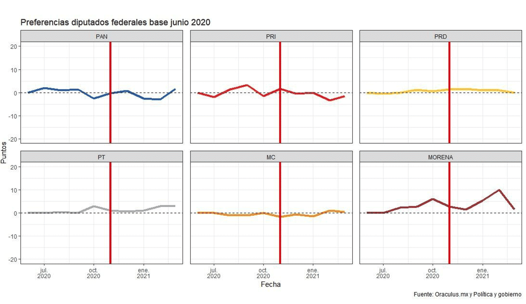 También en semejanza con el caso anterior, los partidos no miembros de la coalición opositora vieron un incremento en sus preferencias desde el anuncio en noviembre 2020 —aunque en general dentro del margen de error—. El alza tras el anuncio se da en los casos del PT y MC, y también en el caso de Morena, que ha crecido —e importantemente, más allá del margen de error— desde diciembre de 2020, aunque inmediatamente después del anuncio de la alianza pasó por una caída.