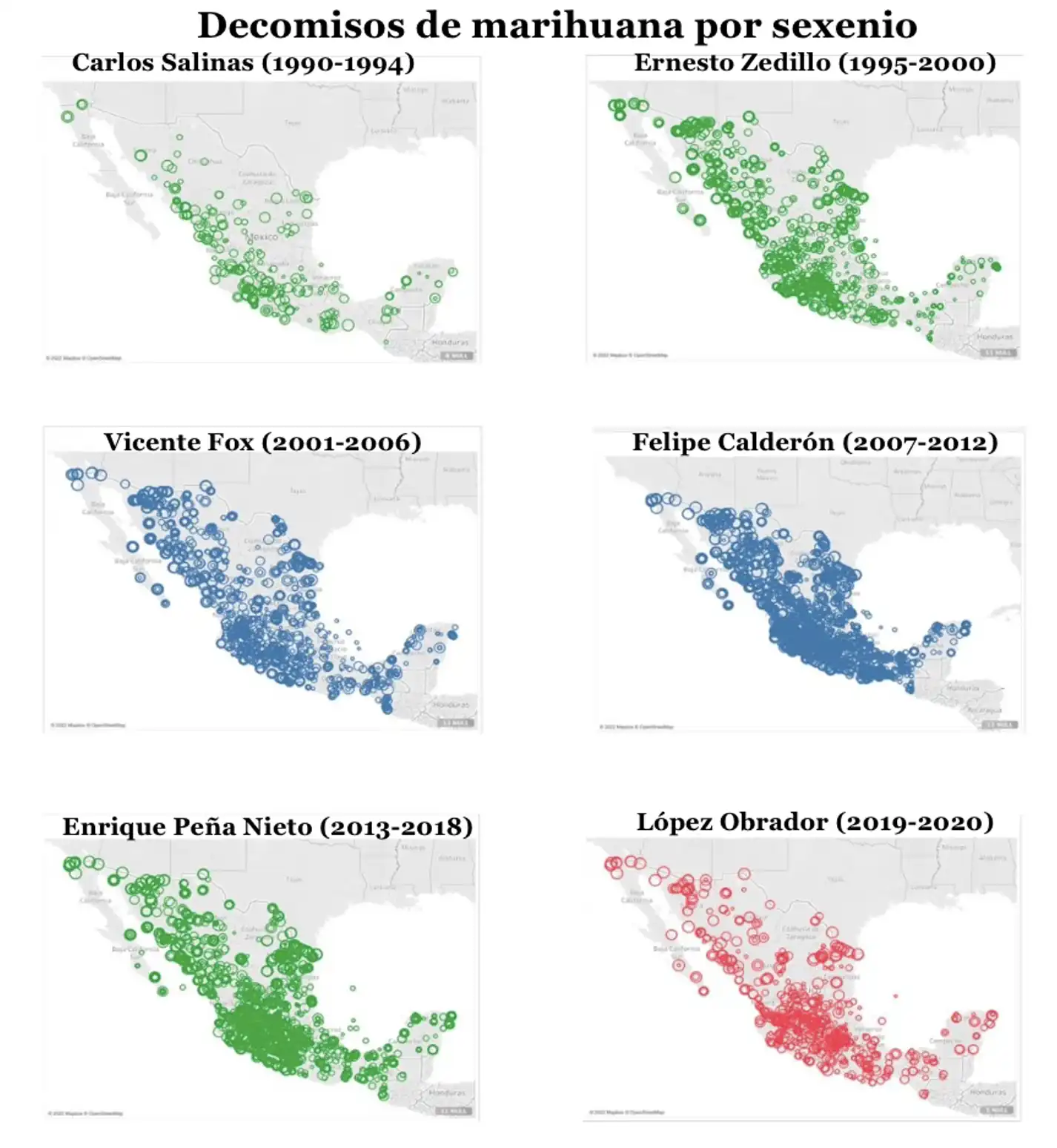 Los siguientes mapas muestran, con certeza, la ubicación de todos los decomisos que se han dado en México desde el año 1990. Al contar esta historia, hay dos fuerzas importantes. Una es la historia de las drogas en sí que comento brevemente en cada caso. La otra, son las políticas públicas que influyeron en el aumento de decomisos. Por este segundo hecho, he dividido la cartografía por sexenios y usado colores característicos a los partidos de cada presidente para diferenciar los mapas. Los presidentes priistas (Carlos Salinas, Ernesto Zedillo y Enrique Peña Nieto), van de verde; los panistas (Vicente Fox y Felipe Calderón), de azul; y el actual presidente López Obrador —del cual sólo están los años 2018-2020— viene del guinda característico de Morena. Cada círculo representa un decomiso y, su tamaño, la cantidad de kilogramos que fueron decomisados.