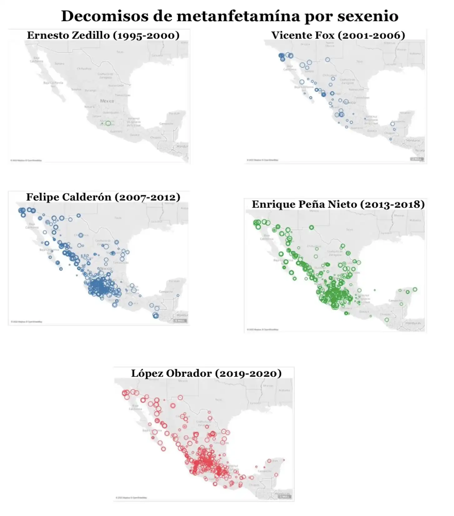 Ahora, si la cocaína fue una droga de llegada reciente, las metanfetaminas lo son aún más. Su relevancia evade el primer sexenio de nuestra serie e, inclusive, en el de Ernesto Zedillo, son escasos los decomisos. Sólo comienzan a crecer con la llegada del milenio, en gran parte, por el aumento de consumo de drogas sintéticas en Estados Unidos con la primera ola de la crisis de opioides en el país. México, con bandas de crimen organizado establecidas, pronto se percató del creciente mercado estadunidense y comenzó a suministrar metanfetaminas aumentando la presencia de la droga en el país. Para la llegada de Calderón y la guerra contra el narcotráfico, otra vez, estallarían los decomisos. Una nueva historia de aumento debido a decisiones puntuales en el sistema político mexicano.