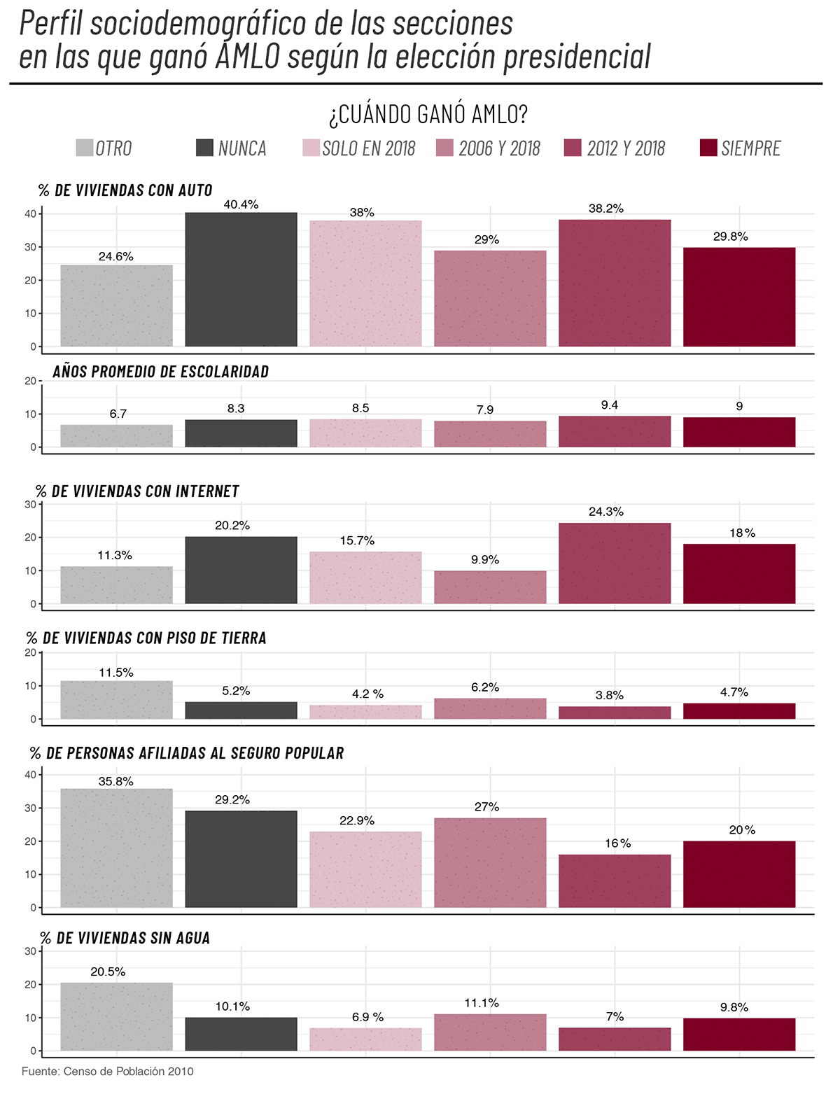 Si observamos aquellas secciones que votaron por AMLO en 2006 y 2018, pero no en 2012, podemos inferir que se trata de secciones rurales, muy probablemente priístas que no pudo llevarse cuando compitió con Enrique Peña Nieto, pero sí cuando compitió contra Roberto Madrazo y José Antonio Meade. Son las secciones con el mayor porcentaje de viviendas con piso de tierra, el mayor porcentaje de viviendas sin agua, un buen porcentaje de la población afiliada al seguro popular, poco conectadas a internet, con los menores años de escolaridad promedio y el menor porcentaje de viviendas con automóvil. Finalmente de las secciones que en las que únicamente fue el ganador durante esta elección, son secciones con valores promedio en todos los indicadores.
