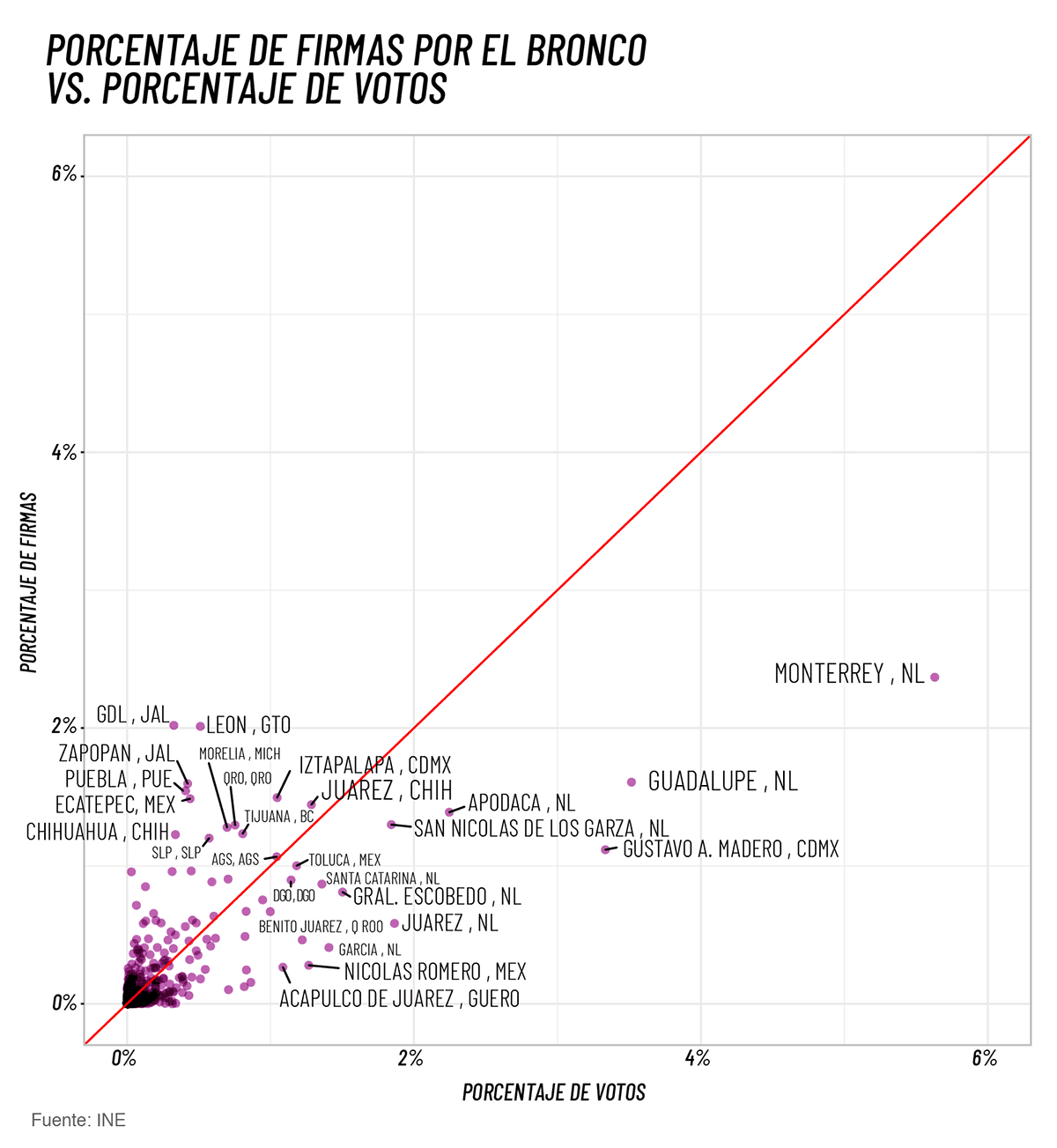 Uno de los eventos más polémicos de la elección fue la candidatura del Bronco. El Tribunal Electoral del Poder Judicial de la Federación ordenó al INE incluir al gobernador de Nuevo León en la boleta, a pesar de que el Instituto Electoral había determinado que si le descontaba el total de apoyos ciudadanos que en realidad eran falsos, como fotocopias de credenciales, el gobernador de Nuevo León no lograba superar el número de firmas para conseguir el registro. Ahora, con los resultados electorales preliminares, podemos cooperar a la controversia comparando el porcentaje de los apoyos del Bronco con el de votos que recibió en cada municipio. Esperaríamos que si los apoyos ciudadanos hubieran sido auténticos, un alto porcentaje de firmas recabadas en ese municipio estuviera relacionado con un alto porcentaje de votos para el Bronco ahí.