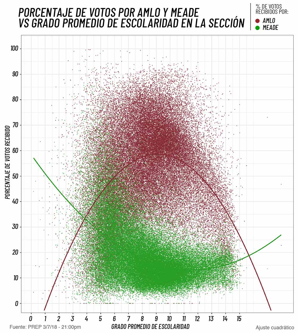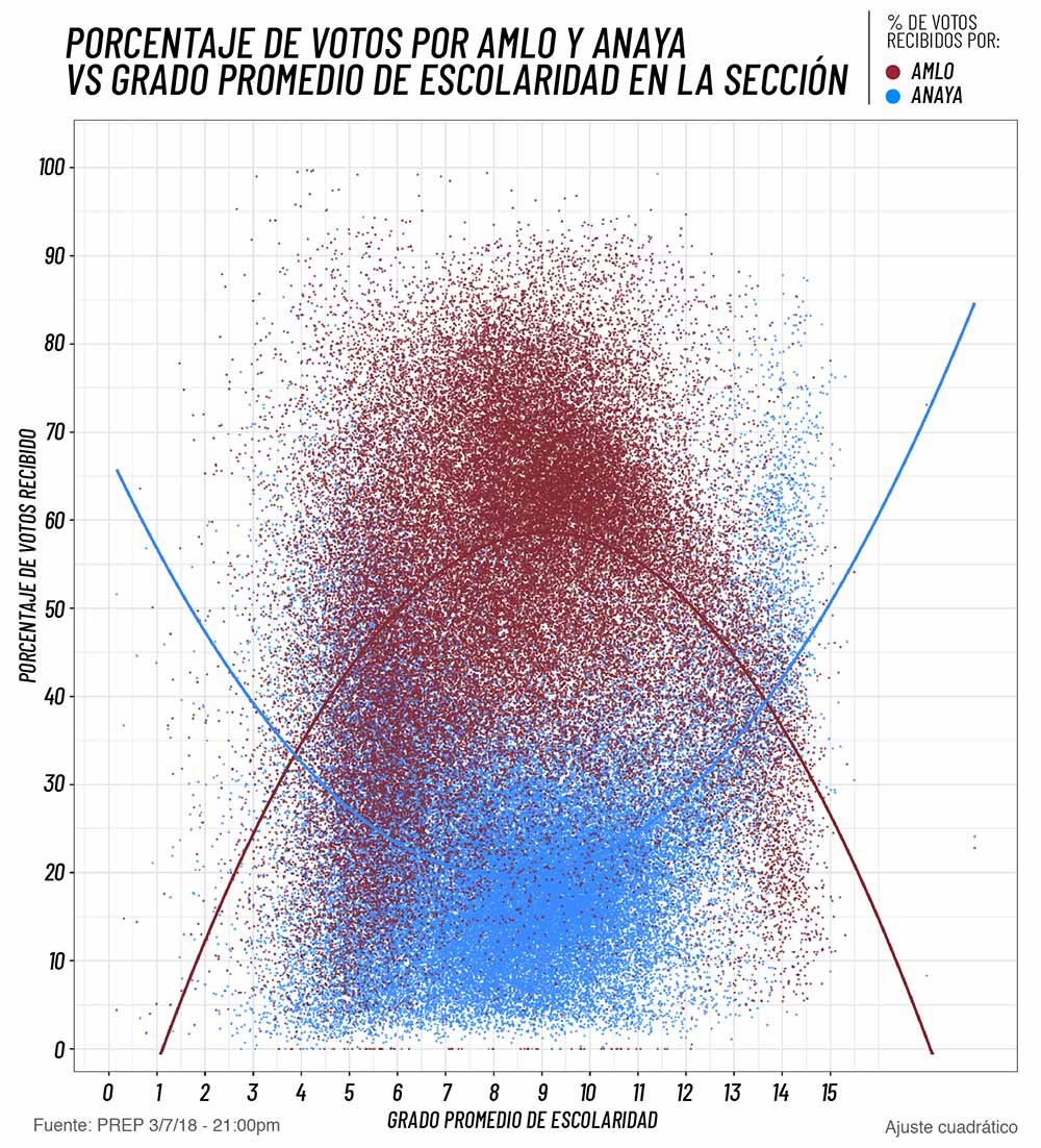 La tendencia en el porcentaje de votos que obtuvo Anaya y AMLO según la escolaridad promedio de la sección son casi espejos la una de la otra: mientras que está asociada positivamente con el porcentaje de votos para AMLO, hasta llegar a una escolaridad promedio de alrededor de 9 años, o secundaria, a partir del cual la relación se vuelve negativa, lo exacto opuesto sucede en el porcentaje de voto para Anaya. La relación entre escolaridad y voto para cada uno de los candidatos se invierte cuando la escolaridad promedio alcanza los 14 años de escolaridad, es decir universidad, es decir, las secciones con muy baja y muy alta escolaridad promedio votaron por Anaya, mientras que las que tienen en promedio una escolaridad de secundaria o prepa lo hicieron por AMLO.