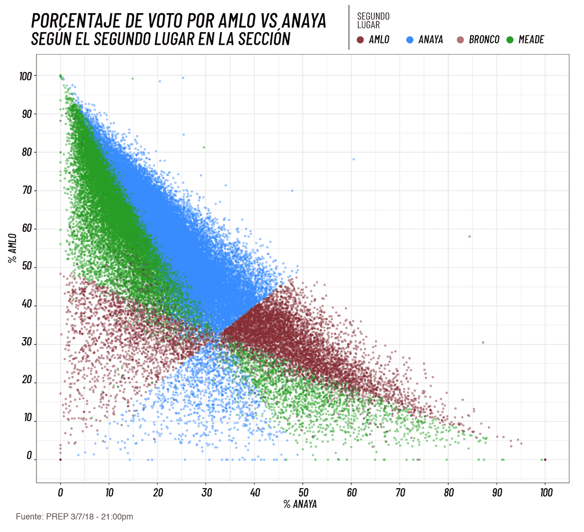 Las consistencia de las segundas preferencia de los votantes resulta evidente si comparamos el porcentaje de votos que obtuvo AMLO vs el que obtuvo Anaya en cada sección y coloreamos cada punto según el candidato que haya quedado en segundo lugar ahí. Cuando AMLO obtuvo un alto porcentaje de los votos, es decir en aquellas secciones en las que factiblemente ganó, Anaya fue el segundo lugar más frecuentemente, aunque Meade conquistó un saludable número de secciones; por el contrario, cuando Anaya obtuvo más de la mitad de los votos, es decir en secciones en las que el candidato del FRENTE fue el favorito, AMLO fue el segundo lugar en mucho mayor proporción que Meade. Las secciones en las que tanto Anaya como AMLO obtuvieron menos del 30% de los votos, es decir en las que probablemente ganó Meade, se dividieron el segundo puesto de manera bastante equitativa entre AMLO y Anaya.