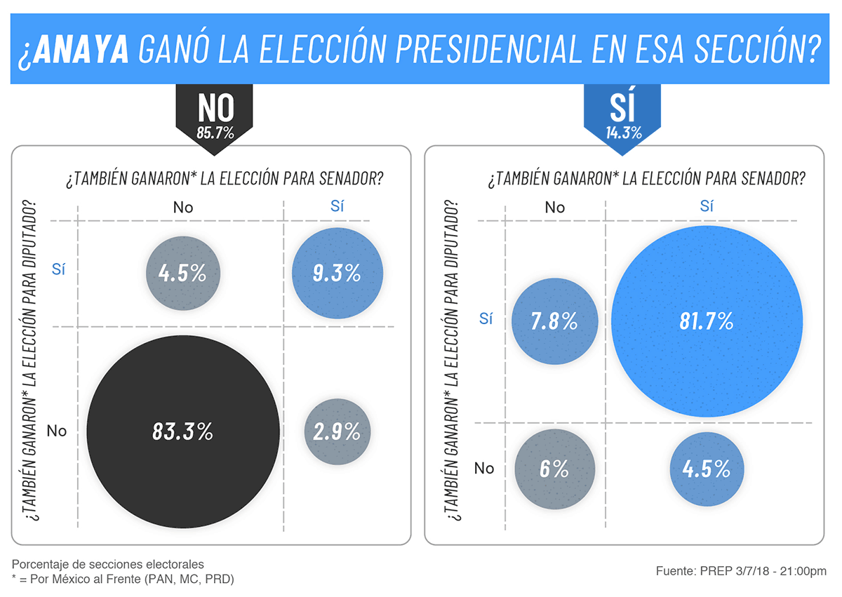 Los votantes del Frente fueron los que menos votaron de manera cruzada, en 81.7% de las secciones donde Anaya ganó la elección presidencial, ganó también la elección para diputados federales y senadores. En el caso del Frente hay también un sesgo a favor de los senadores comparado con los diputados federales, en el 9.3% de las secciones donde Ricardo Anaya no ganó la elección para presidente el Frente sí ganó la elección para senadores.