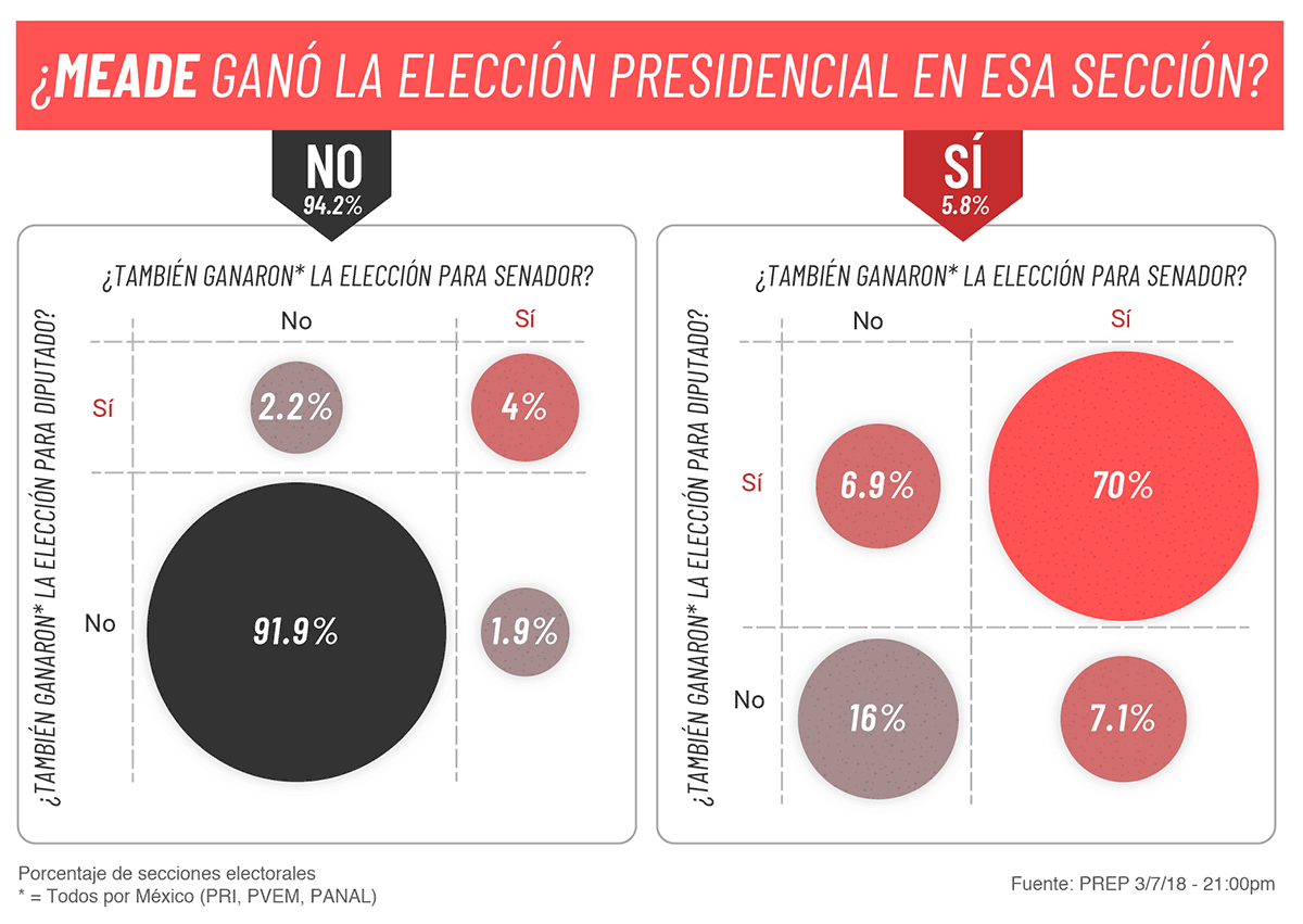 El perfil de Meade buscaba atraer a personas que no fueran priístas tradicionales ¿Funcionó el voto cruzado a favor del candidato del PRI? En el 70% de las secciones donde Meade ganó para presidente, el PRI ganó también las elecciones para diputados y senadores (en 2478 secciones), en 30% ganó a pesar de que los candidatos a senador o diputado del PRI perdieron.