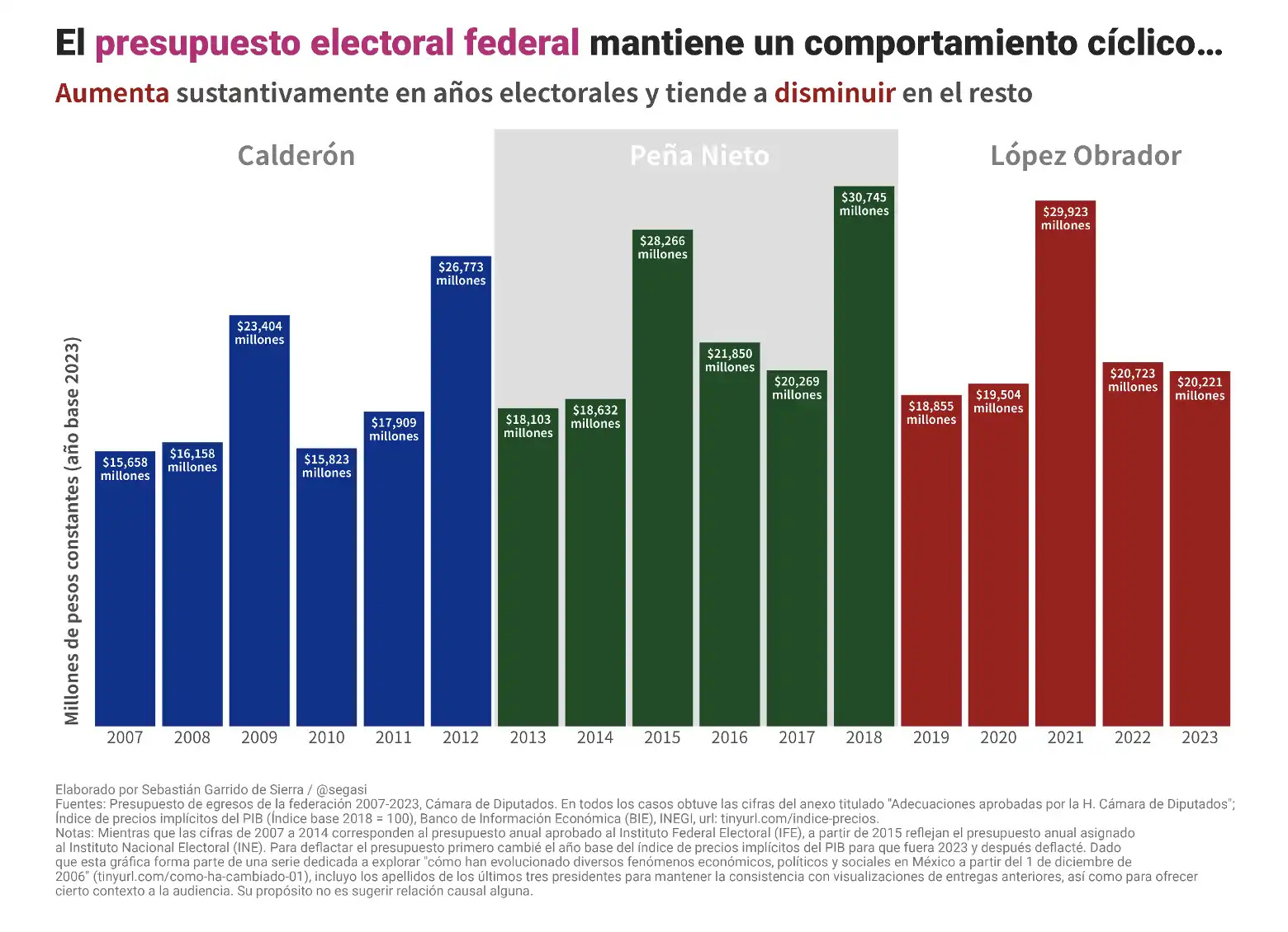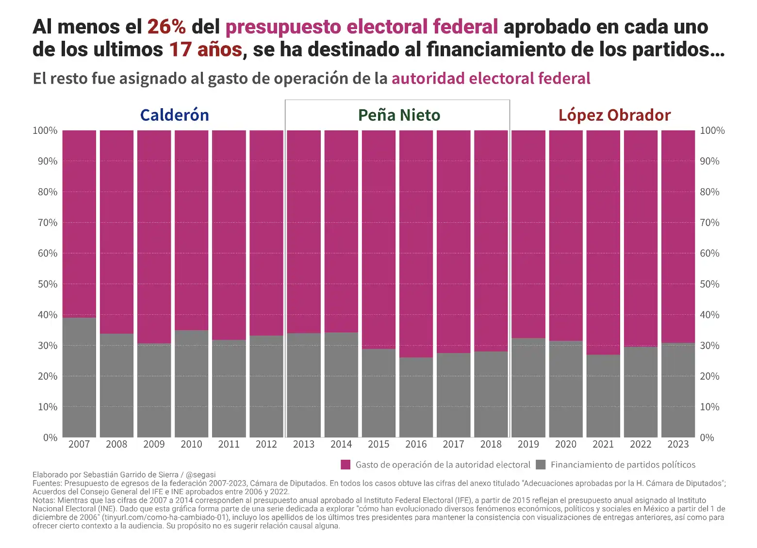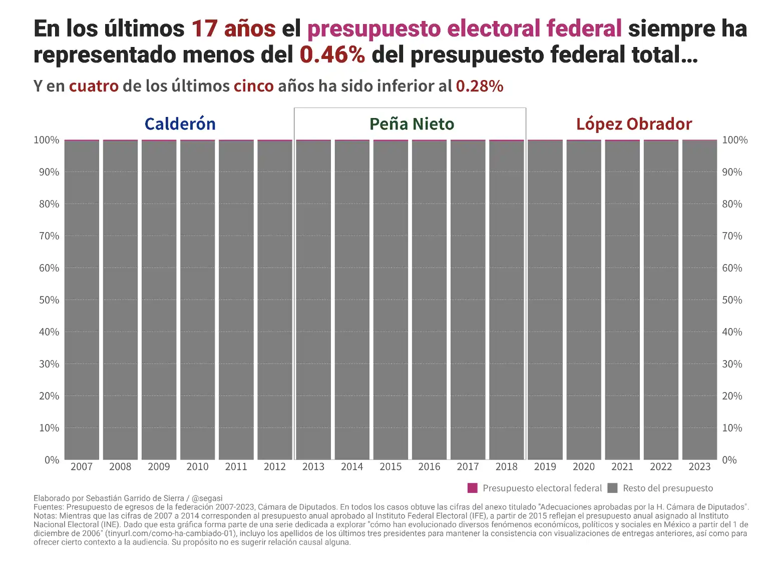 La siguiente gráfica permite poner en perspectiva cuánto representa el presupuesto electoral federal aprobado por la Cámara de Diputados cada año, respecto al presupuesto federal total (o gasto neto total) autorizado por este mismo órgano legislativo. La altura total de cada barra representa el 100 % del presupuesto federal total del año correspondiente. Mientras que la altura de la región rosa (ubicada en la parte superior de cada barra) es proporcional al porcentaje que representa el presupuesto electoral federal respecto al presupuesto federal total, la altura de la región gris corresponde al porcentaje que representa el resto del presupuesto federal.