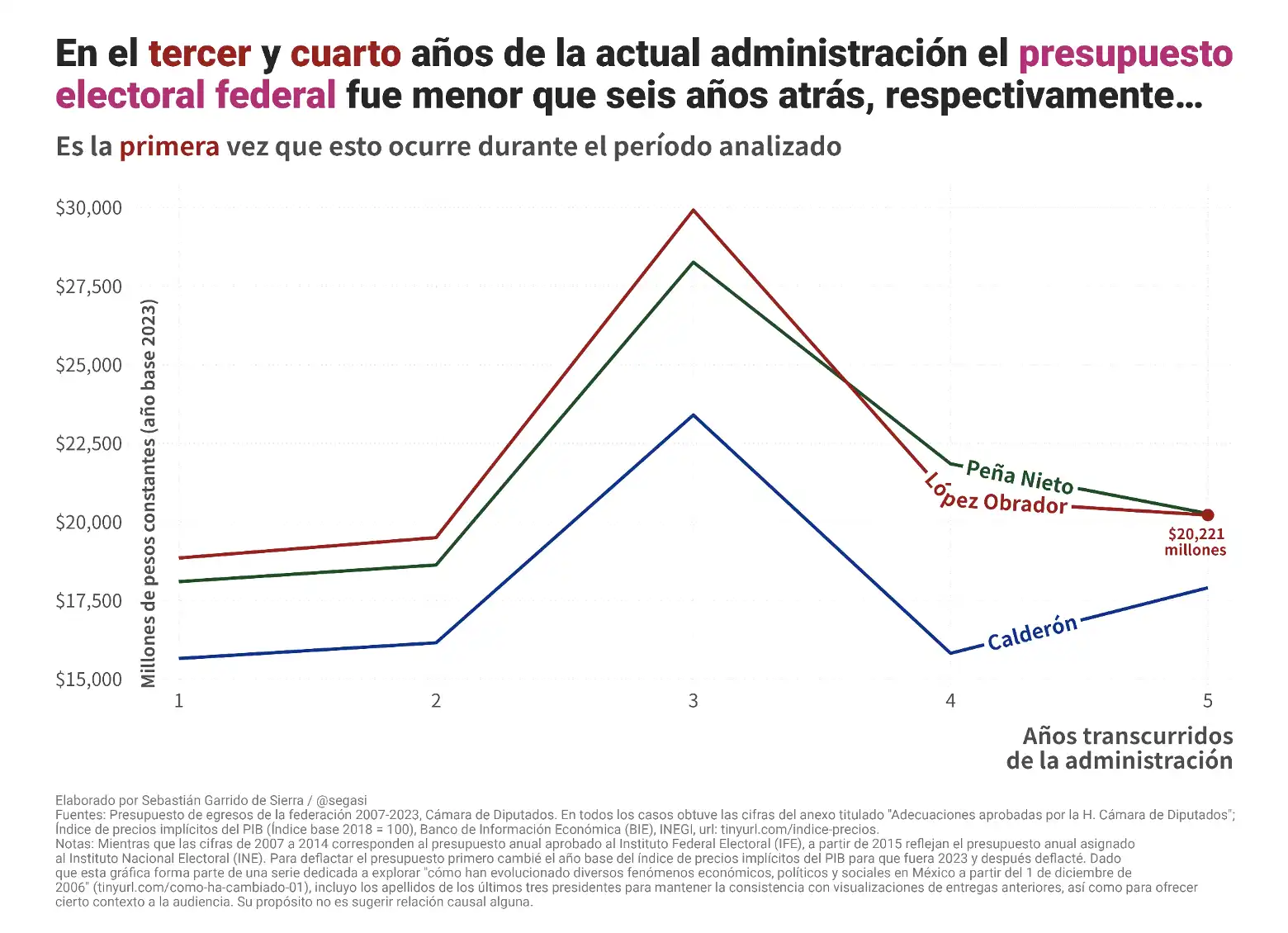 6 Para deflactar el presupuesto electoral federal primero cambié el año base del índice de precios implícitos del PIB para que fuera 2023 en lugar de 2018, y después deflacté.