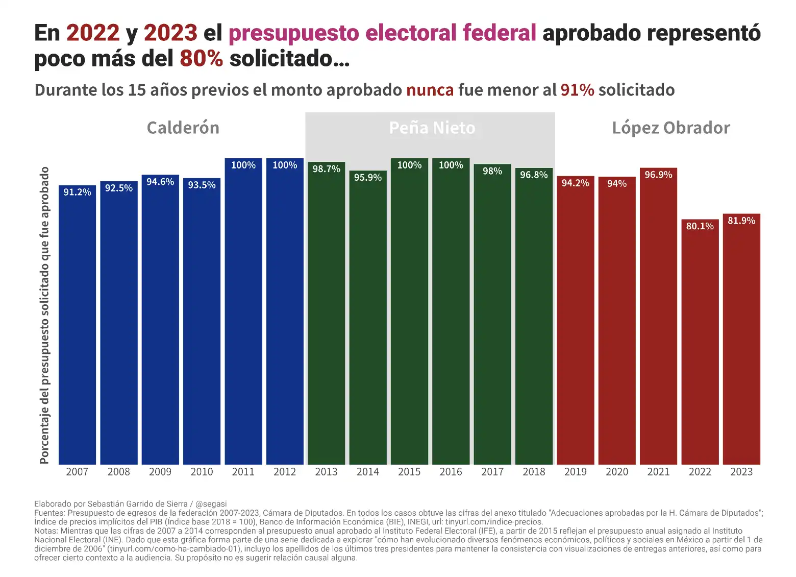 La tercera gráfica muestra qué porcentaje del presupuesto electoral federal solicitado cada año por la autoridad electoral fue aprobado por la Cámara de Diputados. Esta visualización revela que mientras que durante los 15 años transcurridos entre 2007 y 2021 el monto aprobado por la cámara baja nunca fue menor al 91 % solicitado por el IFE o INE, en 2022 y 2023 fue poco mayor al 80 %.