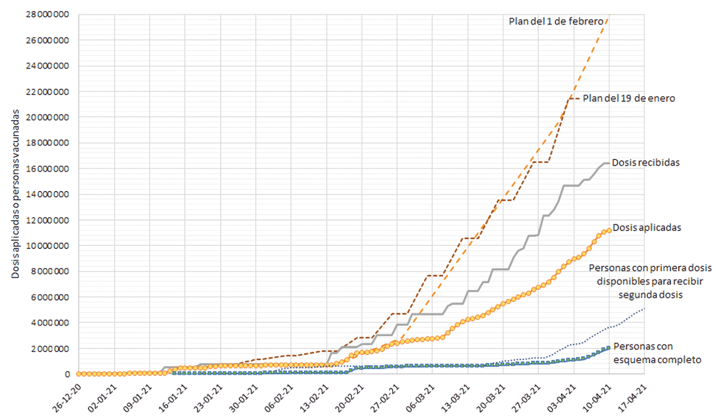 Si nos basamos en el personal de salud vacunado con esquema completo (755 564 de 1.1 millones), al corte del 10 de abril únicamente se tiene un avance del 69 % en la Etapa 1. Si tomamos en cuenta a los 154 974 trabajadores de la salud adicionales que han recibido medio esquema, el avance sería del 76 % (1.67 millones de dosis aplicadas de 2.2 millones de dosis necesarias para cumplir la meta).