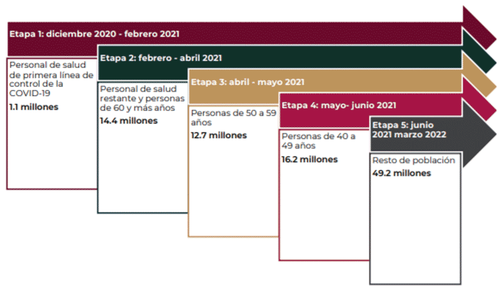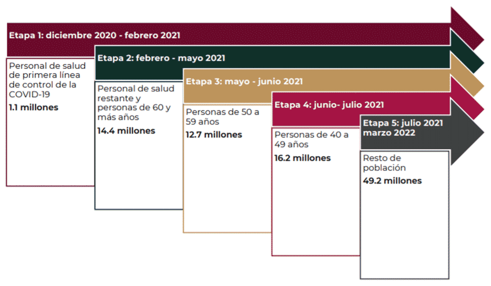 La Secretaría de Salud publicó el 11 de enero el documento rector de la política nacional de vacunación contra el virus SARS-CoV-2. Este documento definió cinco etapas de la estrategia de vacunación por grupos poblacionales: