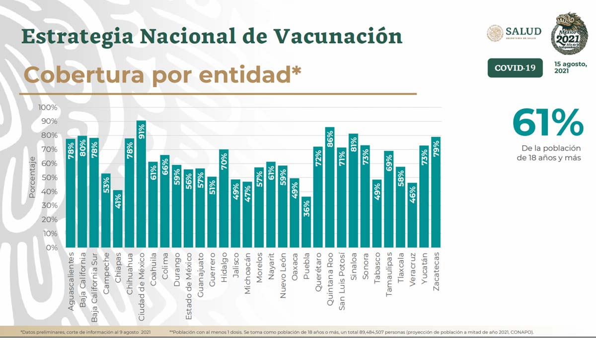 Como la Secretaría de Salud ya no informa el número de personas vacunadas desglosado por grupo objetivo, no es posible cuantificar el avance de cada etapa. Ahora publican cada día una gráfica con el porcentaje de la población adulta de cada entidad que ha recibido al menos una dosis. En Baja California, donde el presidente declaró concluida la vacunación, la cobertura alcanzada es del 80 %, mientras que en la Ciudad de México reportan una cobertura del 91 %. En el otro extremo está Puebla, estado en el que sólo el 36 % de la población adulta ha recibido al menos una dosis de vacunas.