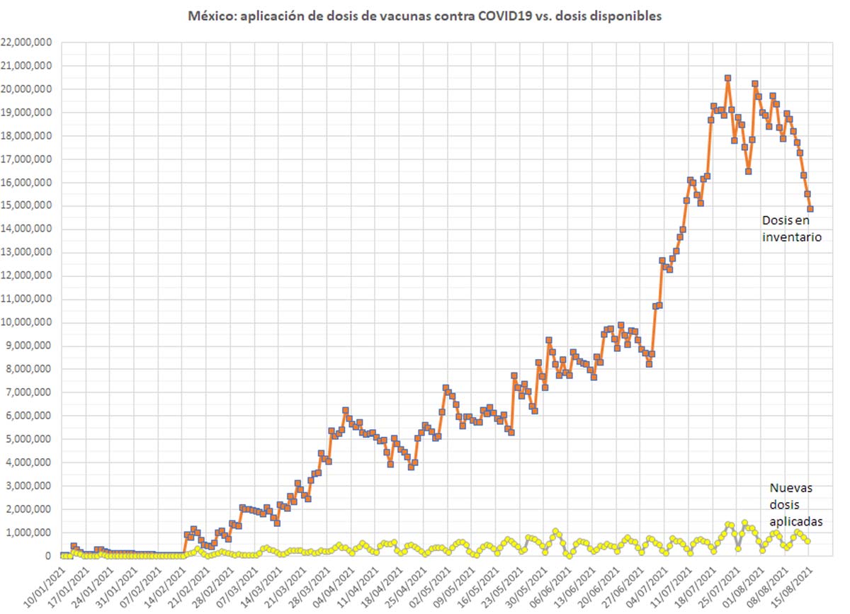 Desde el mes de marzo hasta finales de julio, los volúmenes de entregas de vacunas han excedido en cantidades cada vez mayores los volúmenes semanales de aplicación de las mismas, como se muestra en la gráfica siguiente. Ésta compara las cantidades diarias de dosis aplicadas con las cantidades de dosis disponibles al inicio del día. Por ejemplo, al iniciar el 18 de febrero se contaba con 1 millón de dosis en inventario, y al terminar el día se aplicaron 326 136 de ellas (33 %). El inventario de vacunas no aplicadas ha excedido 14 millones de dosis desde mediados de julio, alcanzando un máximo de 20.5 millones de dosis el 22 de julio. En las últimas dos semanas se ha reducido el inventario de vacunas pendientes de aplicar, dado que se recibieron menos dosis que las que fueron aplicadas. A la fecha de corte del 14 de agosto el inventario se redujo a 14.86 millones de dosis. Ese día se aplicaron 638 029 de las 15.5 millones de dosis disponibles el día anterior (4 %).