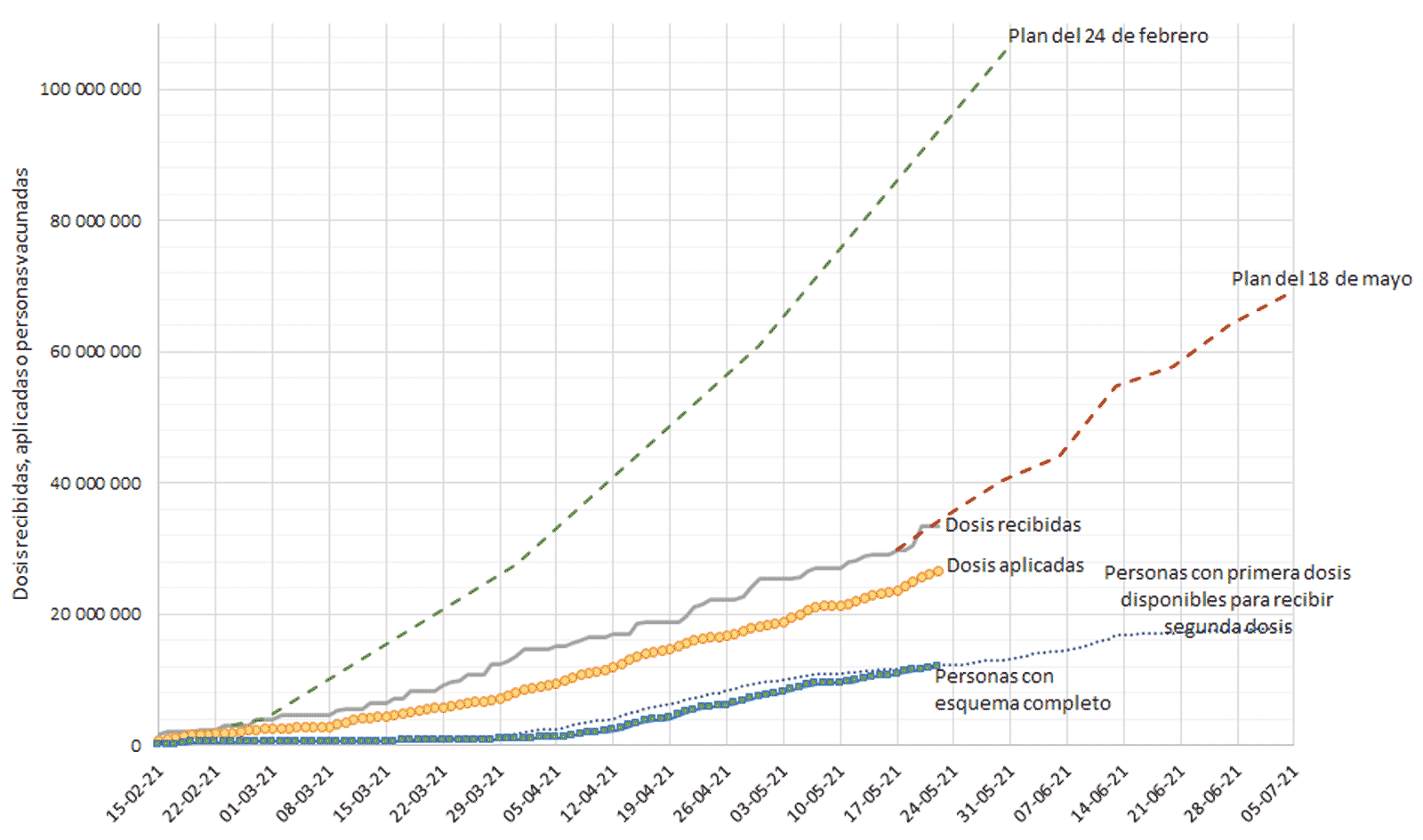 La primera de ellas es la línea verde entrecortada, que corresponde al plan presentado por la Secretaría de Salud el 24 de febrero; detalla las entregas mensuales hasta el mes de mayo. Este plan incluye entregas de todas las vacunas contratadas hasta entonces. Este calendario contemplaba recibir más de 106 millones de dosis.