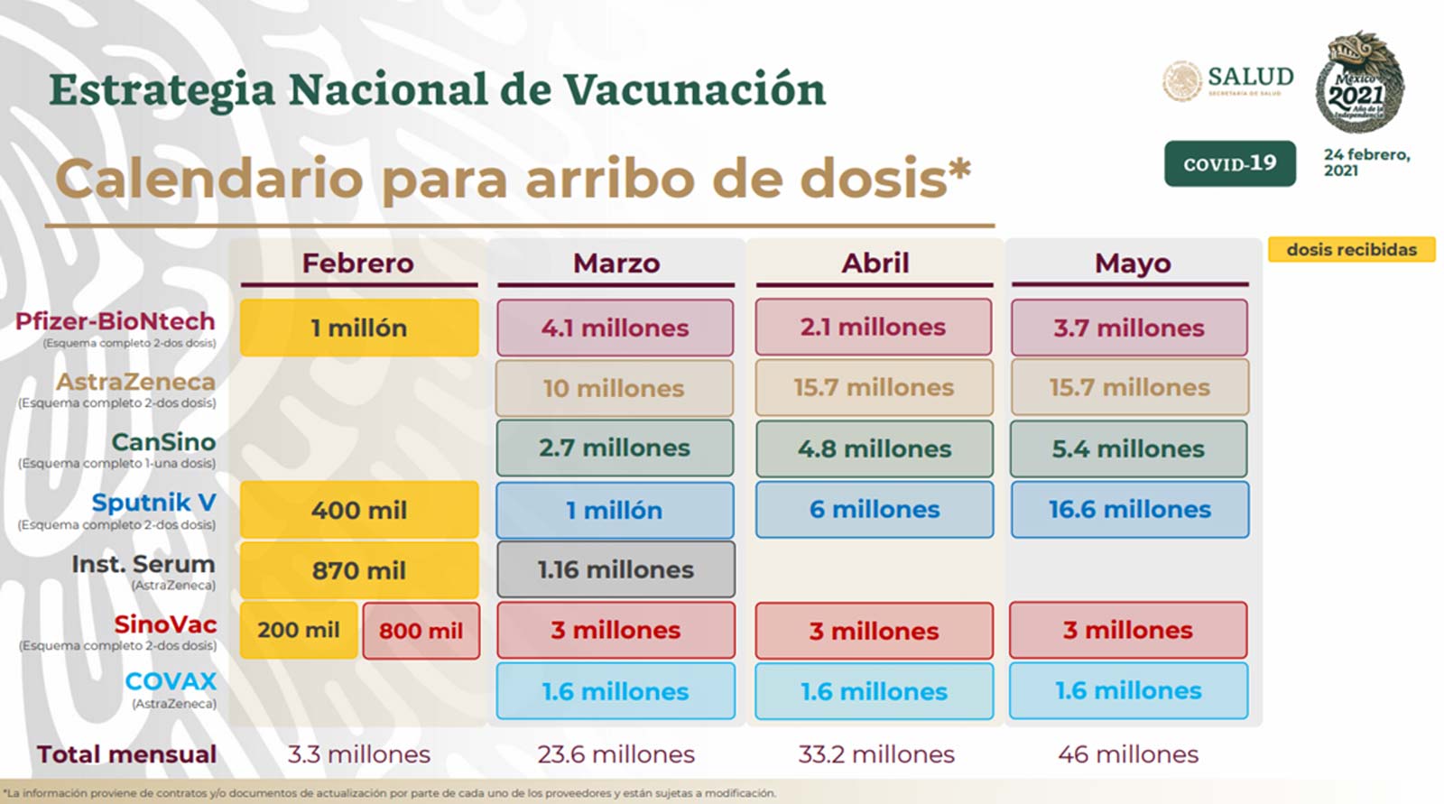 Además de las curvas que representan los planes de vacunación anunciados por funcionarios federales, la línea solida gris en la gráfica ilustra el número acumulado de dosis de vacunas recibidas por México hasta la fecha de corte de este texto: 33.5 millones. Las dosis recibidas y listas para ser aplicadas corresponden a vacunas de Pfizer-BioNTech, AstraZeneca, Sinovac, Sputnik V y CanSino. También se han importado vacunas adicionales a granel de AstraZeneca y CanSino para su envase en México.