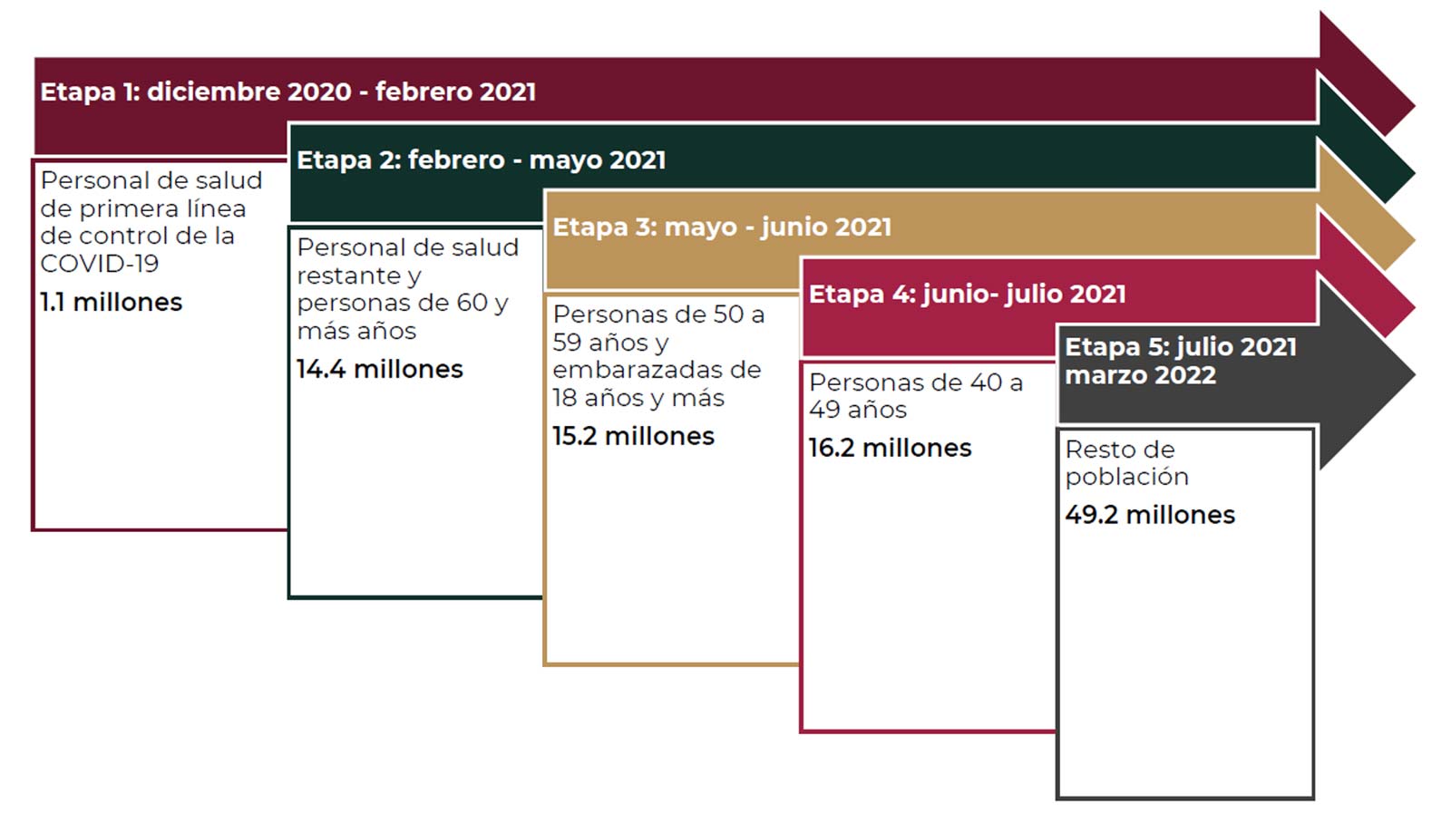 En la Etapa 2 se planeaba vacunar al personal de salud restante y a todas las personas de 60 y más años entre febrero y mayo.3