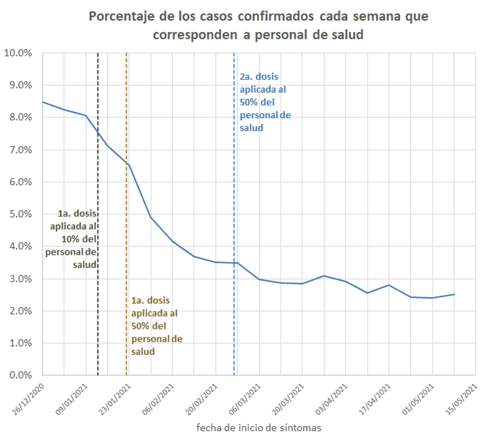 Los casos confirmados entre el personal de salud han disminuido más rápidamente que entre la población en general a partir de mediados de enero, cuando se alcanzó la cobertura del 50 % del personal de salud con al menos una dosis. Antes de iniciar la campaña de vacunación, el personal de salud representaba alrededor del 9 % de los casos de covid-19 detectados en México. La razón se debe a que los lineamientos de la Secretaría de Salud dictan se tome muestra a todo trabajador del sector de salud con síntomas de covid-19, mientras que al resto de la población se le aplica el criterio centinela y sólo se le toma muestra a uno de cada 10 casos con síntomas que no requiera hospitalización. Entre personas con covid-19 confirmado que iniciaron síntomas en la semana que terminó el 8 de mayo, la proporción correspondiente a personal de salud fue sólo el 2.4 %.