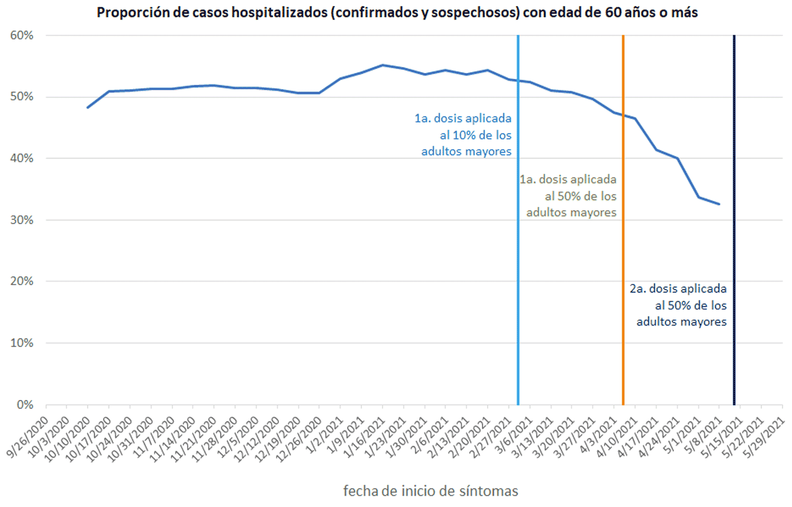 La campaña de vacunación de adultos mayores (de 60 o más años) inició el 15 de febrero. Al 9 de marzo se había aplicado al menos una dosis al 10 % de esta población, y el 6 de abril se alcanzó una cobertura del 50 %. En las gráfica siguientes se puede apreciar que, a partir de marzo el número de casos hospitalizados con covid-19 confirmado o con sospecha ha disminuido más rápidamente en el grupo de adultos mayores que entre los otros grupos de edad, pasando de alrededor de 54 % de los casos antes de iniciar la vacunación al 33 % de los casos entre pacientes que iniciaron síntomas la semana que terminó el 8 de mayo.