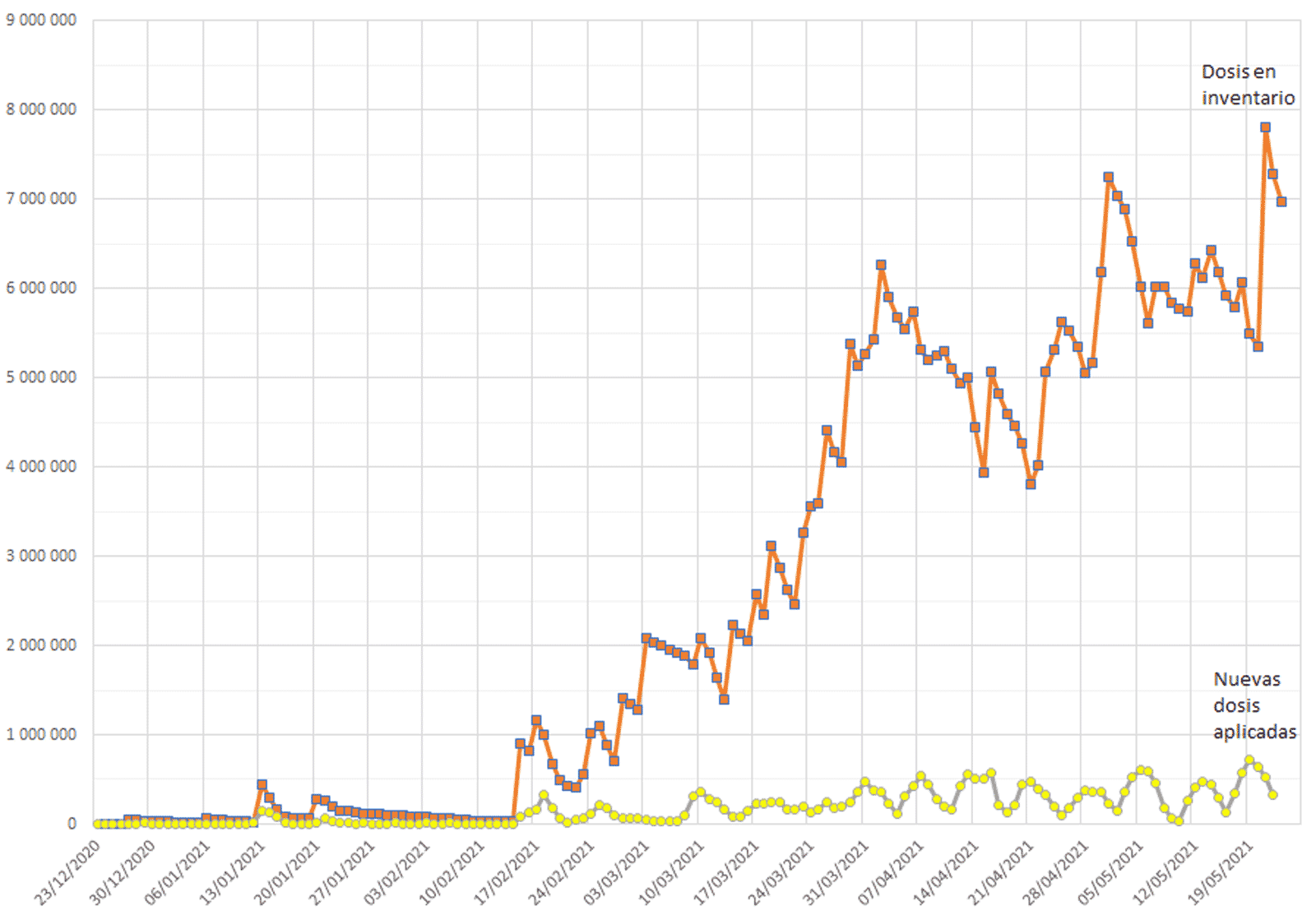 Durante el mes de marzo los volúmenes de entregas de vacunas excedieron en cantidades cada vez mayores los volúmenes semanales de aplicación de las mismas, como se muestra en la gráfica siguiente. Esta gráfica compara las cantidades diarias de dosis aplicadas con las cantidades de dosis disponibles al inicio del día. Por ejemplo, al iniciar el 18 de febrero se contaba con 1 millón de dosis en inventario, y al terminar el día se aplicaron 327 305 de ellas (33 %). Mes y medio después, el 2 de abril, el día inició con 6.26 millones de dosis en inventario, de las que se aplicaron 362 314 (6 %) en el curso de la jornada. El inventario de vacunas no aplicadas fluctuó entre 5 y 8 millones de dosis durante el mes de mayo, cerrando en 6.96 millones de dosis al corte del 22 de mayo. Ese día se aplicaron 323 429 (4.4 %) de las 7.29 millones de dosis disponibles al inicio de la jornada.