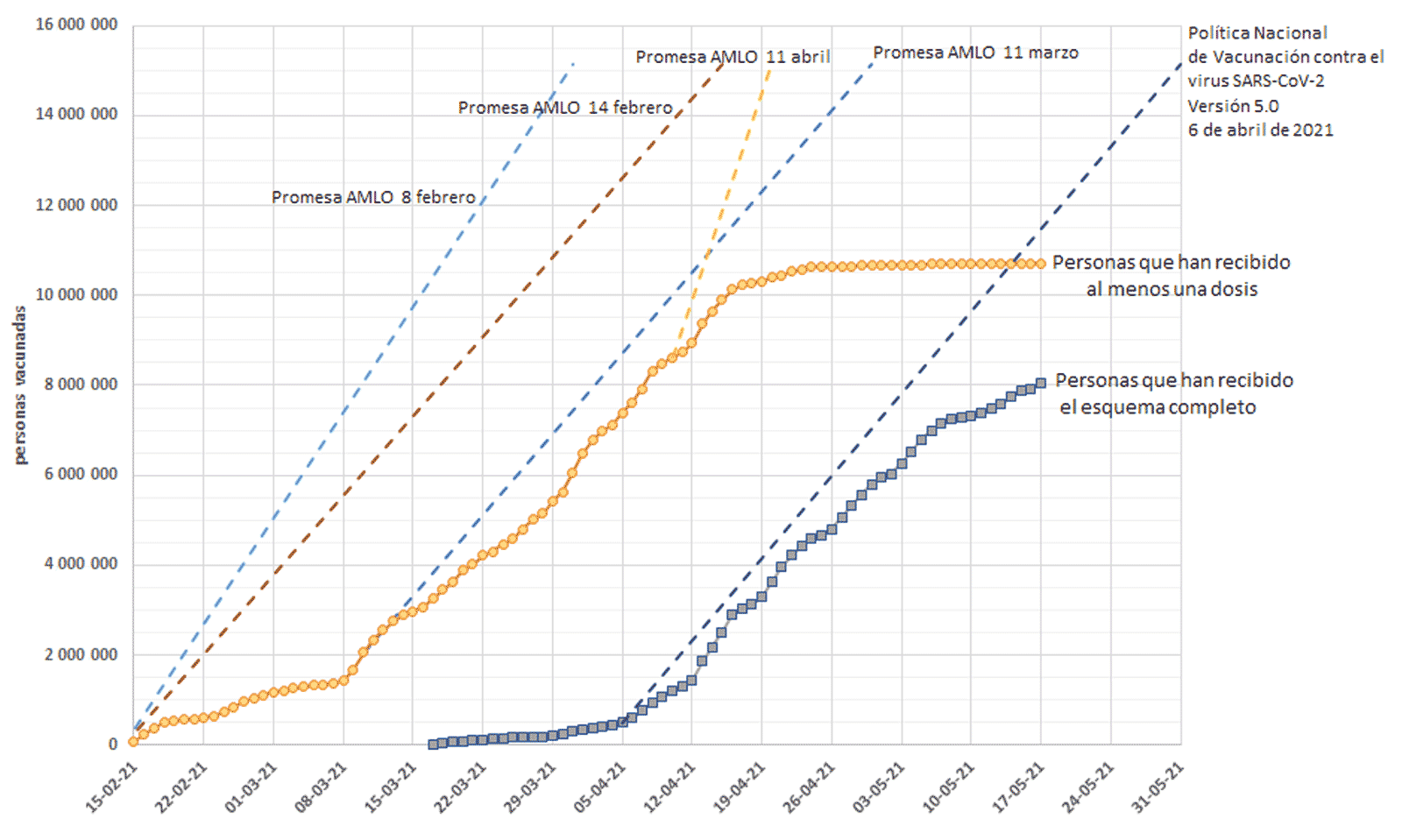 En la gráfica se muestra con una curva punteada azul el número acumulado de esquemas por completar en cada fecha. Esta curva se obtiene sumando 21 días a las curvas acumuladas de aplicación de primeras dosis de las vacunas Pfizer-BioNTech y Sputnik V; 28 días a la de la vacuna SinoVac, y 56 días a la de la vacuna AstraZeneca. Por último, la gráfica muestra también una curva con cuadros verdes con la cifra acumulada de personas que han recibido el esquema completo (esquina inferior derecha). Al corte del 22 de mayo, alrededor de 400 000 personas disponibles para recibir la segunda dosis aún no la han recibido.2