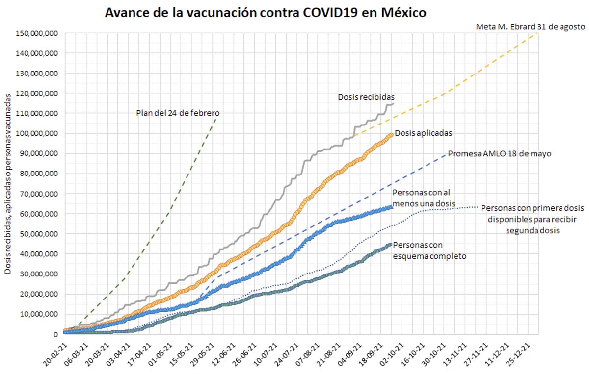 El 30 de abril el presidente anunció que 50 millones de mexicanos estarían vacunados a mediados de año (“a finales de junio, principios de julio”). El 12 de mayo declaró que para finales del mes estarían “a punto de terminar” de vacunar a la población de 50 años en adelante, con al menos una dosis, y el 18 de mayo fijó la meta de “terminar la vacunación para el mes de octubre”. Estas últimas dos promesas están representadas en la gráfica por la línea azul entrecortada.