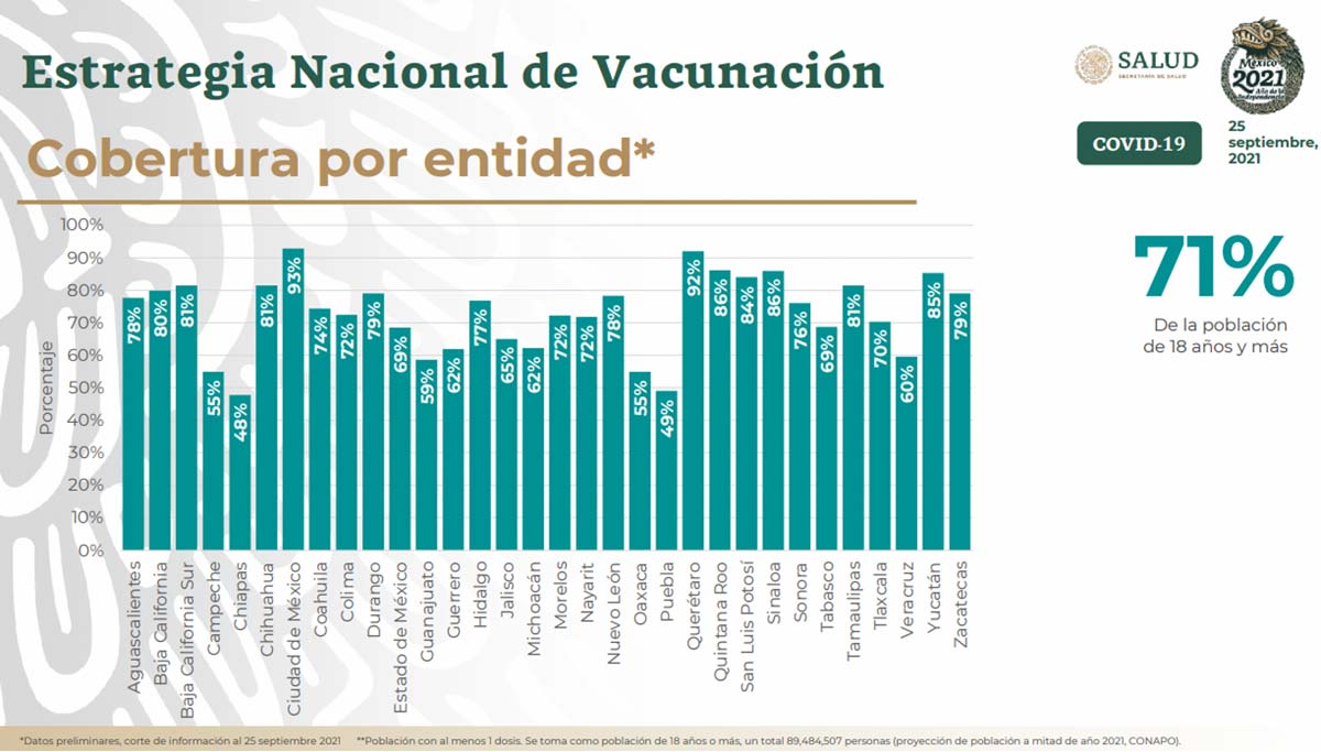 Como la Secretaría de Salud ya no informa el número de personas vacunadas desglosado por grupo objetivo, no es posible cuantificar el avance de cada etapa. Ahora publican cada día una gráfica con el porcentaje de la población adulta de cada entidad que ha recibido al menos una dosis. En Baja California, donde el presidente declaró concluida la vacunación, la cobertura alcanzada es sólo del 80 % mientras que en la Ciudad de México reportan una cobertura del 93 %. En el otro extremo está Chiapas, estado en el que sólo el 48 % de la población adulta ha recibido vacunas. Llama la atención el contraste en acceso a la vacunación entre la Ciudad de México y el vecino Estado de México, en el que sólo el 69 % de los adultos han recibido al menos una dosis.