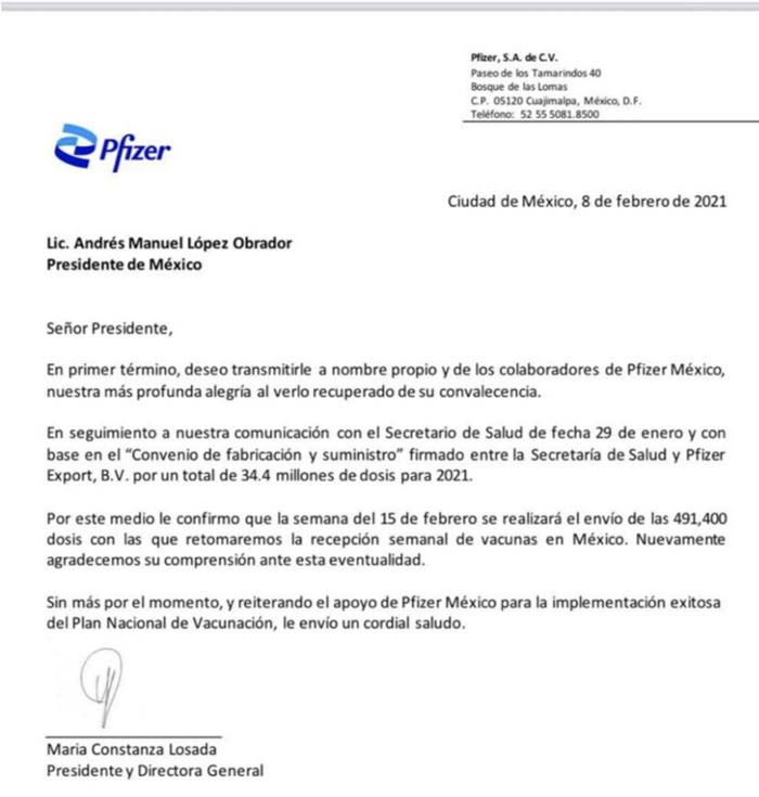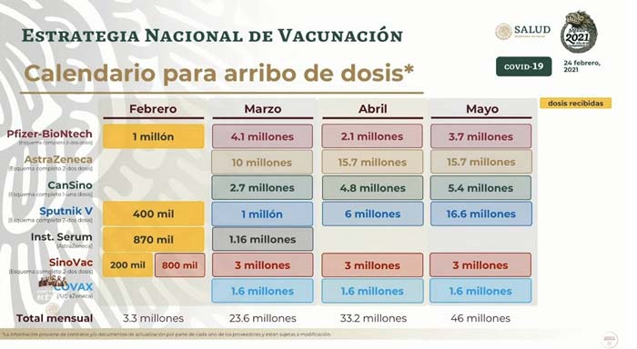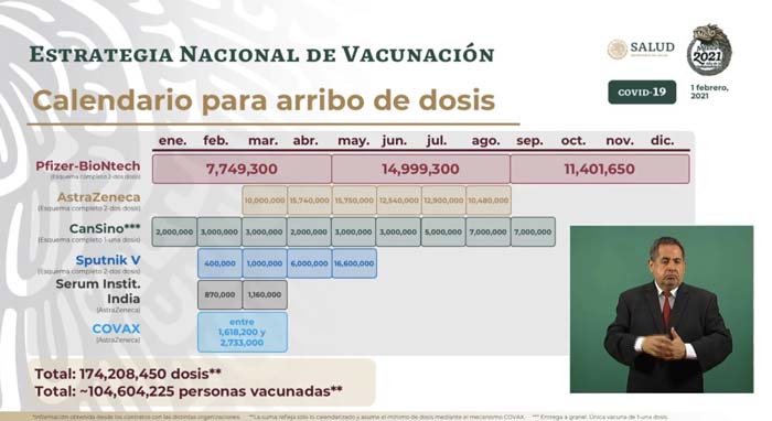 El 1 de febrero, el canciller presentó un nuevo calendario de arribo de dosis de vacunas. Este nuevo plan redujo de 900 000 a 400 000 el número de dosis de la vacuna Sputnik V a ser recibidas en el primer bimestre. El nuevo calendario añadió las 870 000 dosis de la vacuna AstraZeneca adquiridas al Serum Institute de la India en el mes de febrero, y un número adicional de dosis de la misma vacuna aún por determinar a través del mecanismo Covax. El calendario también menciona cinco millones de dosis a granel de la vacuna CanSino, a ser envasadas en México.