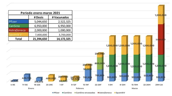 Ante la incertidumbre en las fechas de envasado de la vacuna CanSino y en el número de dosis a ser recibidas del mecanismo COVAX, el plan representado por la línea naranja entrecortada incluye únicamente entregas de vacunas AstraZeneca compradas al Serum Institute, vacunas Pfizer-BioNTech y vacunas Sputnik V.