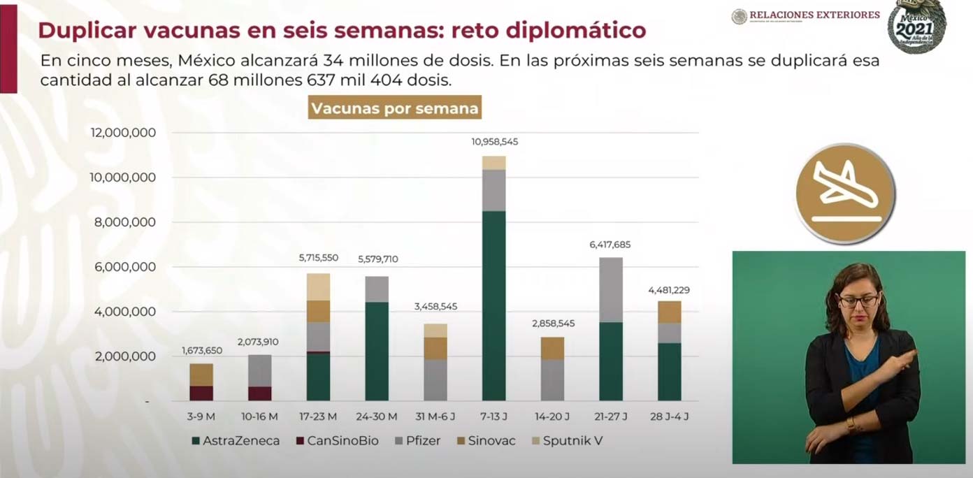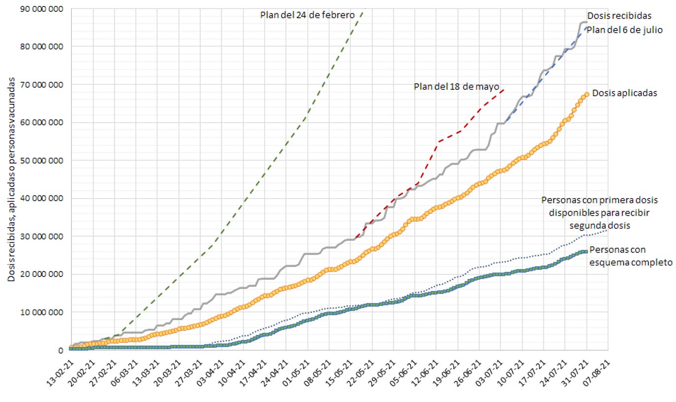 En la conferencia mañanera del 6 de julio, el canciller pospuso a mediados de julio la meta de recibir 70 millones de dosis y anunció que para fines de julio se habrían recibido 85 millones de dosis. Este nuevo plan está representado por la línea azul entrecortada en la gráfica.