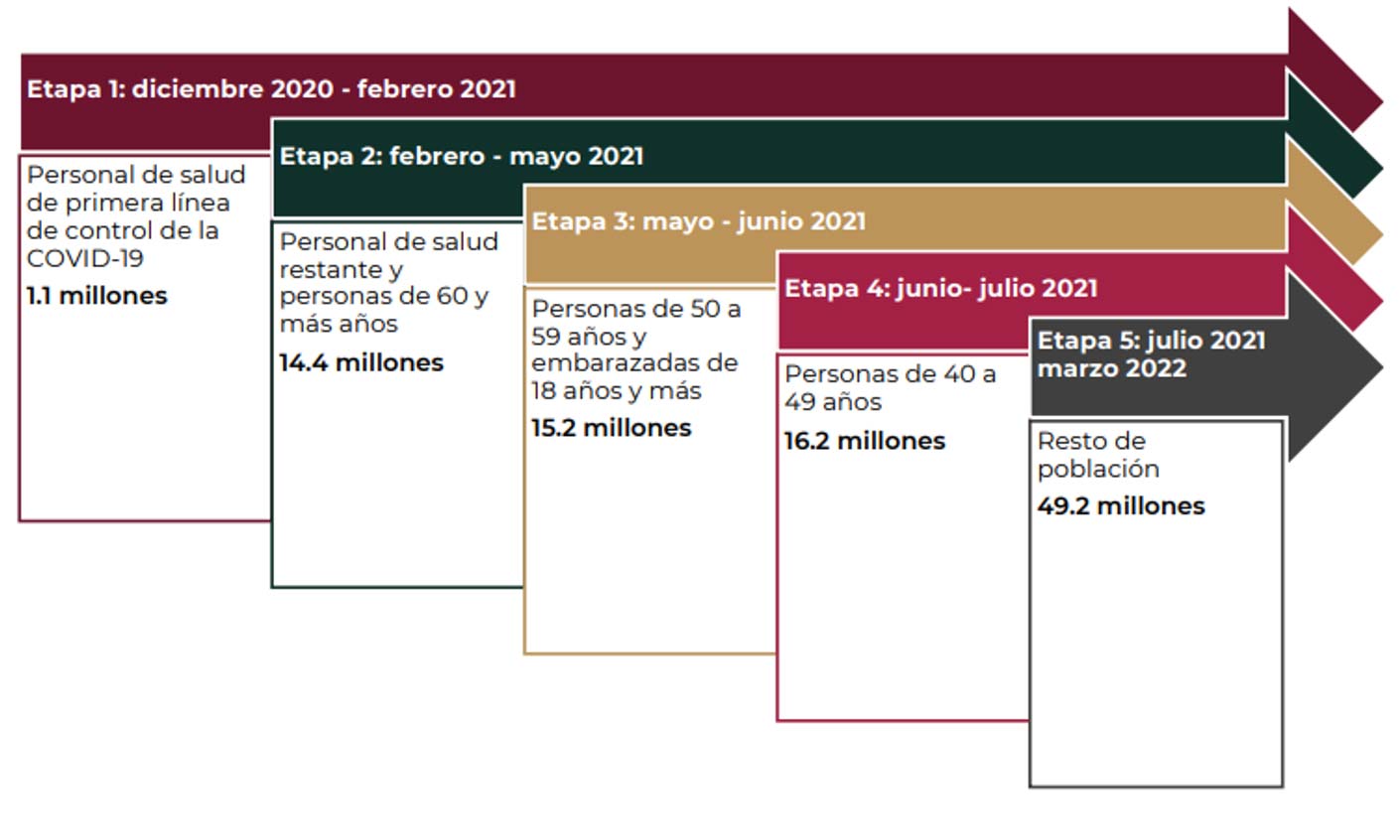 En la Etapa 2 se planeaba vacunar al personal de salud restante y a todas las personas de 60 y más años entre febrero y mayo.3