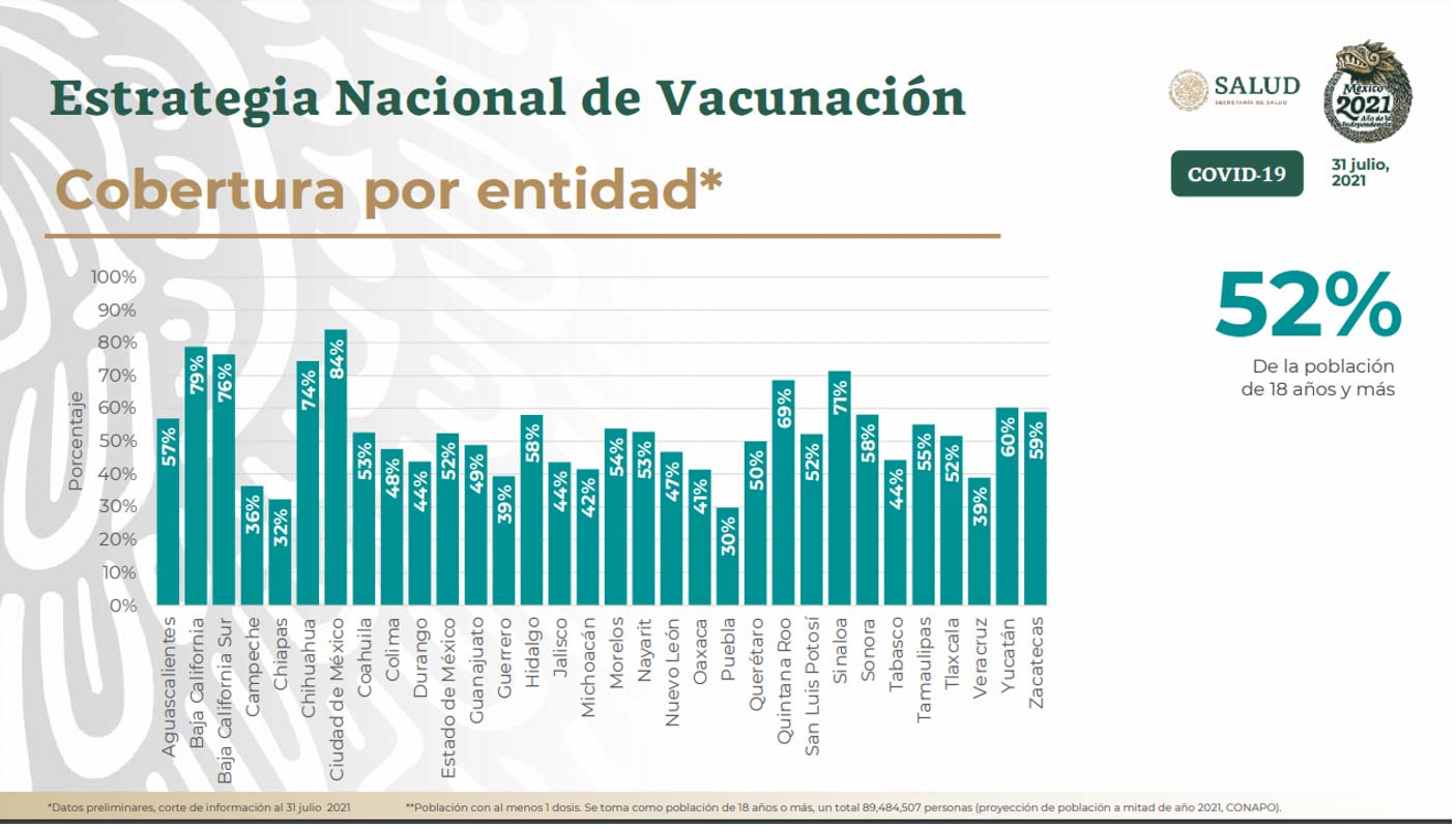 Como la Secretaría de Salud ya no informa el número de personas vacunadas desglosado por grupo objetivo, no es posible cuantificar el avance de cada etapa. Ahora publican cada día una gráfica con el porcentaje de la población adulta de cada entidad que ha recibido al menos una dosis. En Baja California, donde el presidente declaró concluida la vacunación, la cobertura alcanzada es del 79 % mientras que en la Ciudad de México reportan una cobertura del 84 %. En el otro extremo está Puebla, estado en el que sólo el 30 % de la población adulta ha recibido al menos una dosis de vacunas.