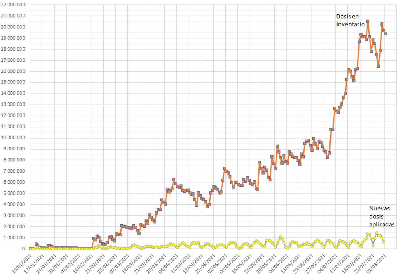 Desde el mes de marzo los volúmenes de entregas de vacunas han excedido en cantidades cada vez mayores los volúmenes semanales de aplicación de las mismas, como se muestra en la gráfica siguiente. Ésta compara las cantidades diarias de dosis aplicadas con las cantidades de dosis disponibles al inicio del día. Por ejemplo, al iniciar el 18 de febrero se contaba con 1 millón de dosis en inventario, y al terminar el día se aplicaron 326 136 de ellas (33 %). El inventario de vacunas no aplicadas ha excedido 16 millones de dosis desde mediados de julio, cerrando en 19.4 millones de dosis al corte del 31 de julio. Ese día se aplicaron 642 856 (3.3 %) de las 19.7 millones de dosis disponibles al inicio de la jornada.