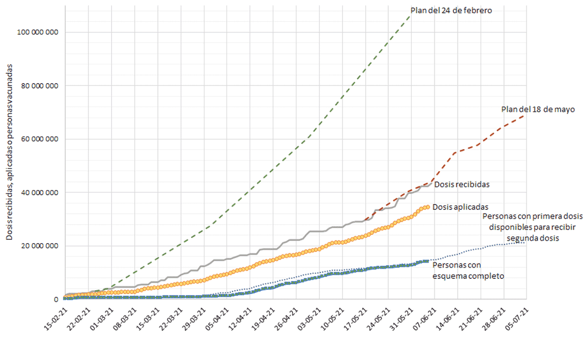 La primera de ellas es la línea verde entrecortada, que corresponde al plan presentado por la Secretaría de Salud el 24 de febrero; detalla las entregas mensuales hasta el mes de mayo. Este plan está representado por la línea verde entrecortada e incluye entregas de todas las vacunas contratadas hasta entonces. Este calendario contemplaba recibir más de 106 millones de dosis.