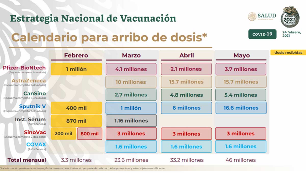 Además de las curvas que representan los planes de vacunación anunciados por funcionarios federales, la línea solida gris en la gráfica ilustra el número acumulado de dosis de vacunas recibidas por México hasta la fecha de corte de este texto: 42.3 millones. Las dosis recibidas y listas para ser aplicadas corresponden a vacunas de Pfizer-BioNTech, AstraZeneca, Sinovac, Sputnik V y CanSino. También se han importado vacunas adicionales a granel de AstraZeneca y CanSino para su envase en México.