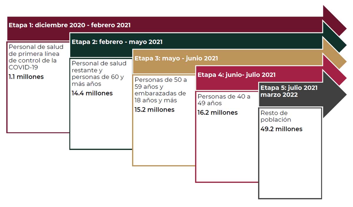 La Secretaría de Salud publicó el 11 de mayo su actualización más reciente al documento rector de la política nacional de vacunación contra el virus SARS-CoV-2. Este documento define cinco etapas de la estrategia de vacunación por grupos poblacionales: