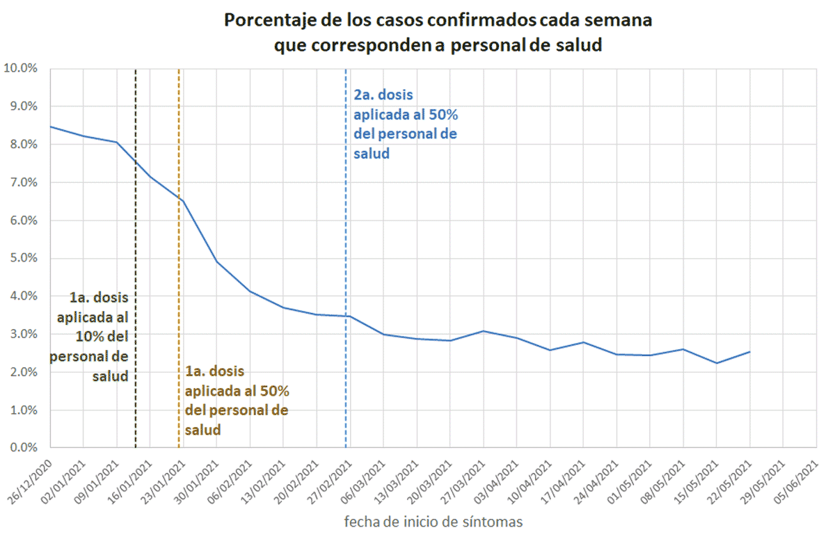 Los casos confirmados entre el personal de salud han disminuido más rápidamente que entre la población en general a partir de mediados de enero, cuando se alcanzó la cobertura del 50 % del personal de salud con al menos una dosis. Antes de iniciar la campaña de vacunación, el personal de salud representaba alrededor del 9 % de los casos de covid-19 detectados en México. La razón se deber que los lineamientos de la Secretaría de Salud dictan que se tome muestra a todo trabajador del sector de salud con síntomas de covid-19, mientras que al resto de la población se le aplica el criterio centinela y sólo se le toma muestra a uno de cada 10 casos con síntomas que no requiera hospitalización. Entre personas con covid-19 confirmado que iniciaron síntomas en la semana que terminó el 22 de mayo, la proporción correspondiente a personal de salud fue sólo el 2.5 %.