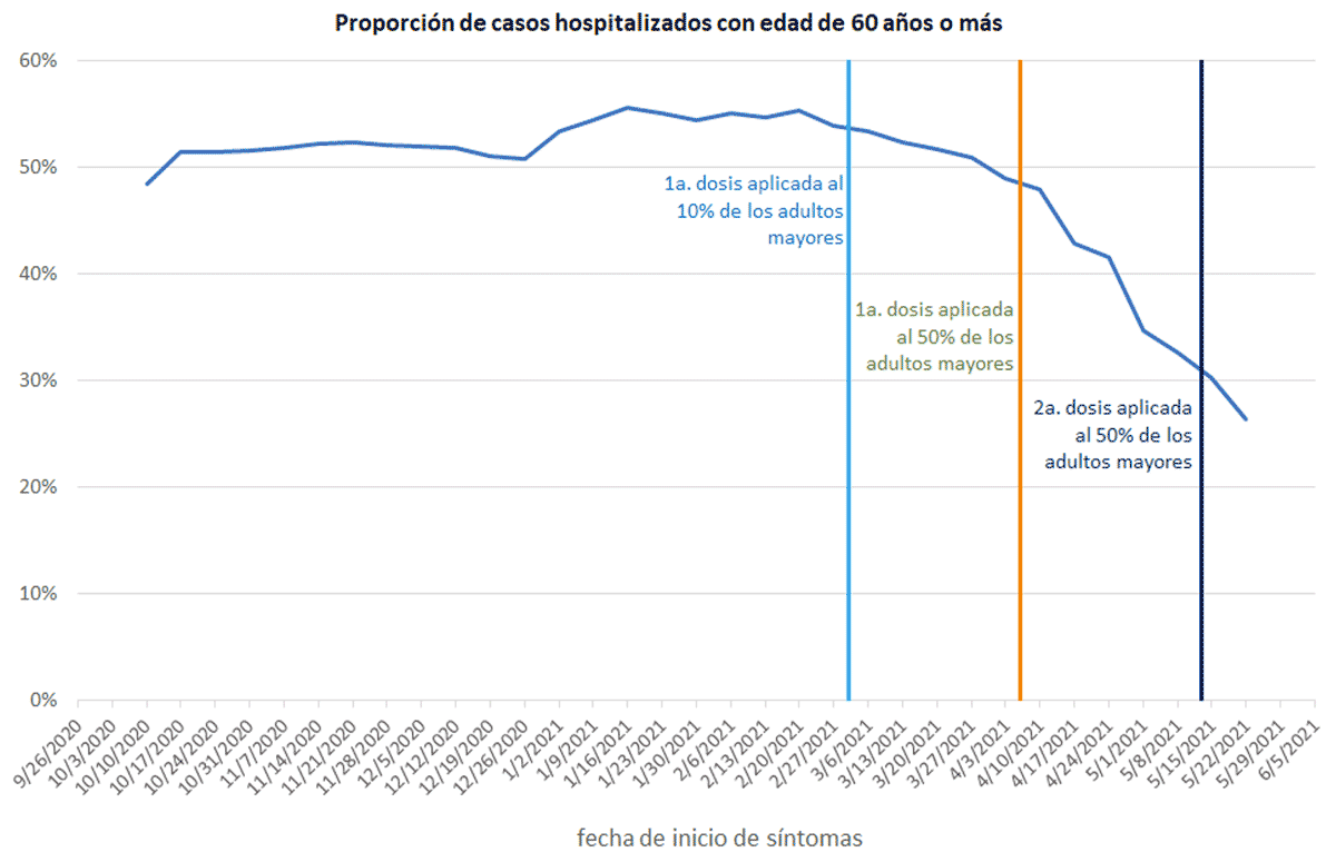 La campaña de vacunación de adultos mayores (de 60 o más años) inició el 15 de febrero. Al 9 de marzo se había aplicado al menos una dosis al 10 % de esta población, y el 6 de abril se alcanzó una cobertura del 50 %. En las gráfica siguientes se puede apreciar que, a partir de marzo, el número de casos hospitalizados con covid-19 confirmado o con sospecha ha disminuido más rápidamente en el grupo de adultos mayores que entre los otros grupos de edad, pasando de alrededor de 54 % de los casos antes de iniciar la vacunación al 26 % de los casos entre pacientes que iniciaron síntomas la semana que terminó el 22 de mayo.