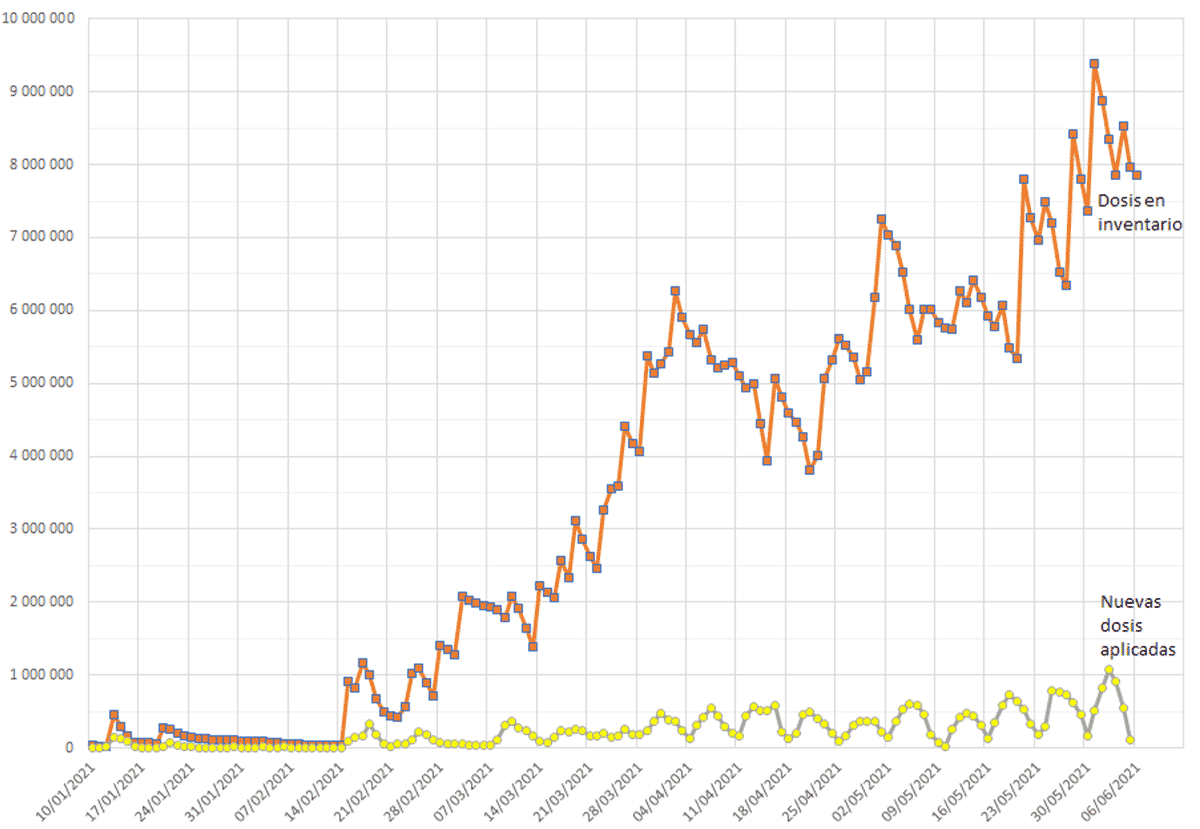 Como se muestra en la gráfica siguiente, durante el mes de marzo los volúmenes de entregas de vacunas excedieron en cantidades cada vez mayores los volúmenes semanales de aplicación de las mismas. La gráfica compara las cantidades diarias de dosis aplicadas con las cantidades de dosis disponibles al inicio del día. Por ejemplo, al iniciar el 18 de febrero se contaba con 1 millón de dosis en inventario, y al terminar el día se aplicaron 327 305 de ellas (33 %). El inventario de vacunas no aplicadas fluctuó entre 5.3 y 9.4 millones de dosis durante el mes de mayo, cerrando en 7.86 millones de dosis al corte del 5 de junio. Ese día se aplicaron 109 389 (1.4 %) de las 7.97 millones de dosis disponibles al inicio de la jornada.