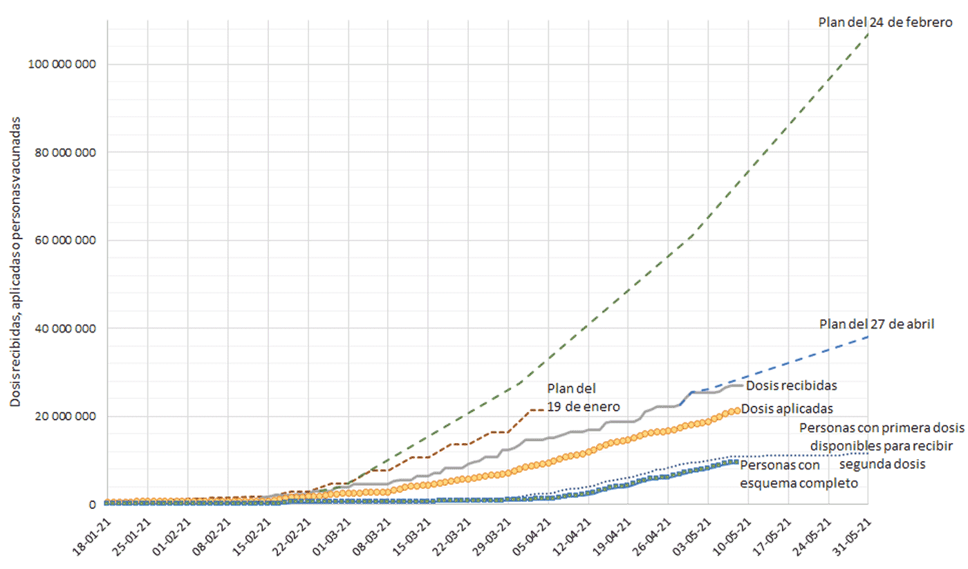 El 27 de abril, la cancillería presentó nueva información sobre arribos esperados de vacunas durante el resto de abril y en el mes de mayo. Este nuevo programa no contempla recibir en mayo ninguna dosis de vacuna AstraZeneca envasada en México, y reduce drásticamente las recepciones esperadas de vacunas Sputnik V y CanSino respecto a lo anunciado en febrero. Este nuevo plan está representado por la línea azul entrecortada y llega únicamente a 38 millones de dosis recibidas al 31 de mayo, cantidad 64 % menor a las 106 millones de dosis anticipadas en el calendario anunciado el 24 de febrero.