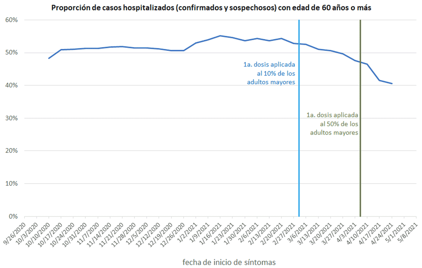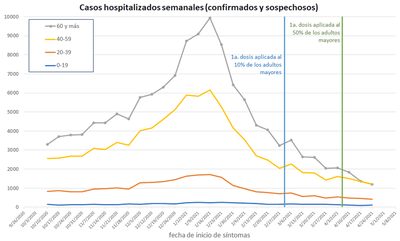 La campaña de vacunación de adultos mayores (de 60 o más años) inició el 15 de febrero. Al 9 de marzo se había aplicado al menos una dosis al 10 % de esta población, y el 6 de abril se alcanzó una cobertura del 50 %. En las gráficas siguientes puede apreciarse que, a partir de marzo, el número de casos hospitalizados por covid-19 confirmado o con sospecha ha disminuido más rápidamente en el grupo de adultos mayores que entre los otros grupos de edad, pasando de alrededor de 54 % de los casos previos al inicio de la vacunación al 40 % de los casos entre pacientes que iniciaron síntomas la semana que terminó el 24 de abril.